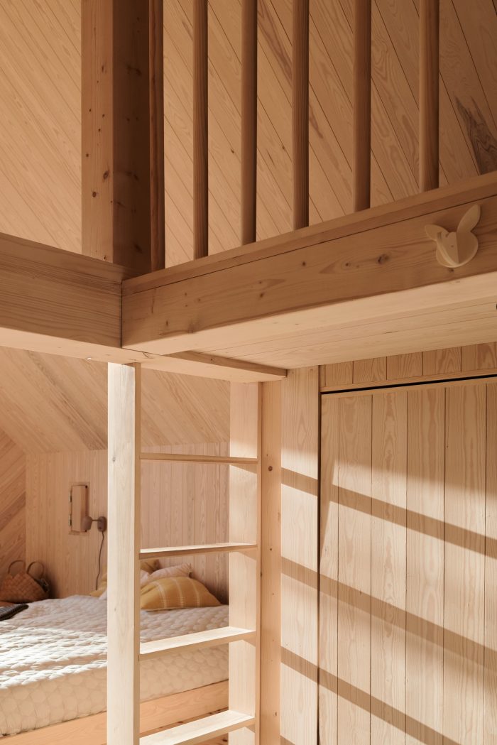 小木屋紧挨着一个老木屋,与新木屋的大小差不多。两者共同形成了一个有角度的庭院,朝着太阳和西南方向的主要景观开放。我们曾考虑对旧的小屋进行改造和扩建,但客户希望在表达和材料上保留旧的小屋的质量,因此放弃了改造项目。取而代之的是,这两座小木屋被串联使用,新的小木屋拥有所有的现代设施,如水和电,而旧的小木屋则在需要时提供额外的居住和睡眠空间(甚至在更简陋的条件下)。