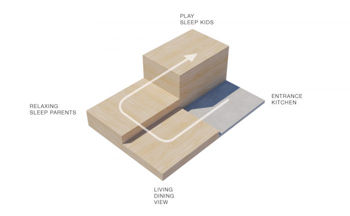 The interior has a simple but functional concept with levels going up and around the central area. From the roughest floor by the entrance a step goes up to the living area. Two steps further up is the recreational area combined with a sleeping area for the adults and then at the top of the ladder is the play- and sleeping area for the children. Bathroom and storage is placed in the remaining area underneath the respective levels.