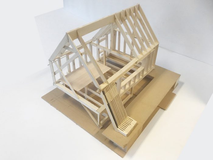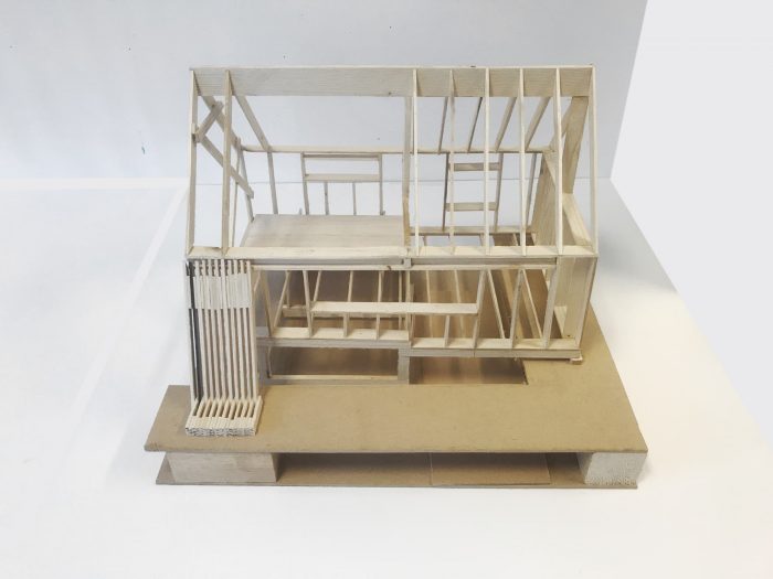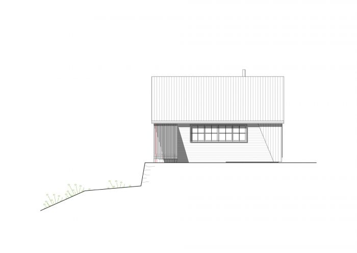 It was important for the client to keep the old fashioned 1930s charm in the main outdoor area. The new cabin has therefore windows in this facade that relate to the windows of the old cabin. At the same time the client wanted to have an undisturbed view towards the sunset. To avoid conflict between these two goals a bench is placed in front of the open glass corner, concealing the latter from the outdoor area. The bench also contains a steel support for the roof, such that the view from within can be even less disturbed by avoiding a support in the glass corner.