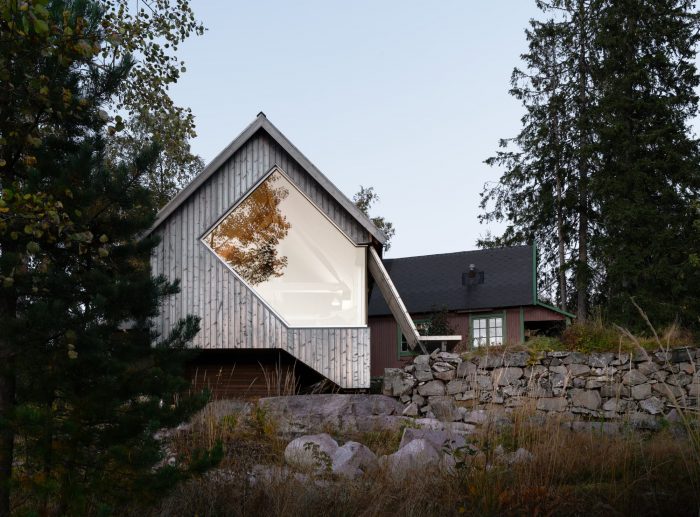 对客户来说,在主要的户外区域保持1930年代的老式魅力是很重要的。因此,新的小木屋在这个外墙上有与老木屋的窗户有关的窗户。同时,客户希望有一个不受干扰的夕阳美景。为了避免这两个目标之间的冲突,在开放的玻璃角前放置了一个长凳,将后者从户外区域隐藏起来。长椅上还有一个用于屋顶的钢制支架,这样一来,由于避免了玻璃角上的支架,从内部看去,就可以少受干扰了