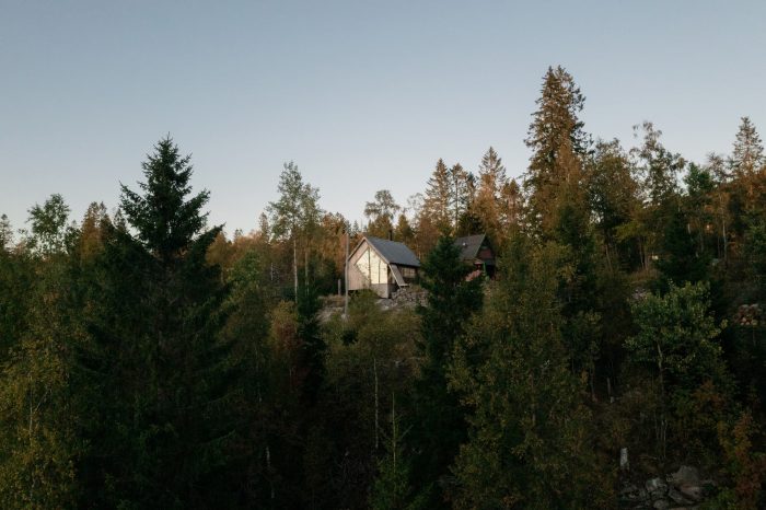 This small cabin in Nordmarka, Oslo's immediate wilderness, fits well within the tradition of boltholes. It contains the most necessary features, but not much more. It is easy to keep clean and easy to maintain. It is light and open, but also intimate and cosy. Beyond the cosiness and the strictly practical, the effort has been mainly focused on the qualities of the site, including a serious commitment to the main view with sunset, woods and lakes.