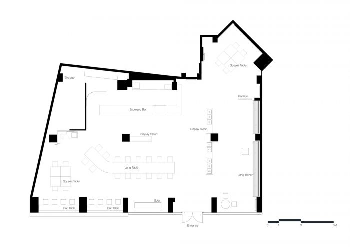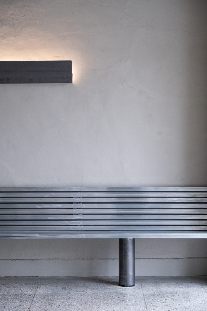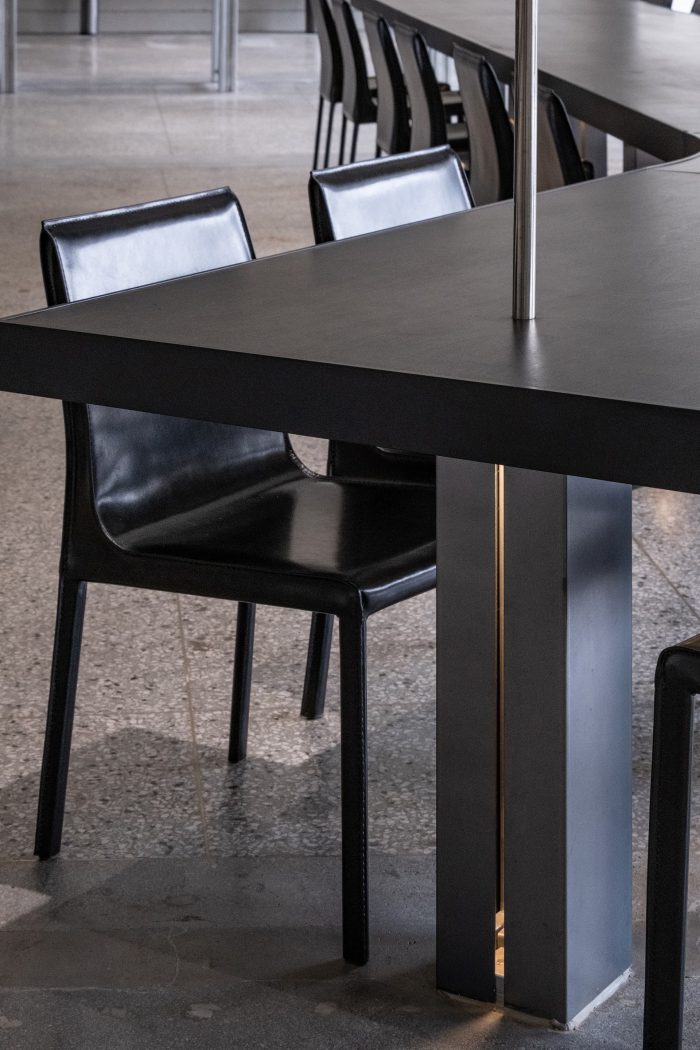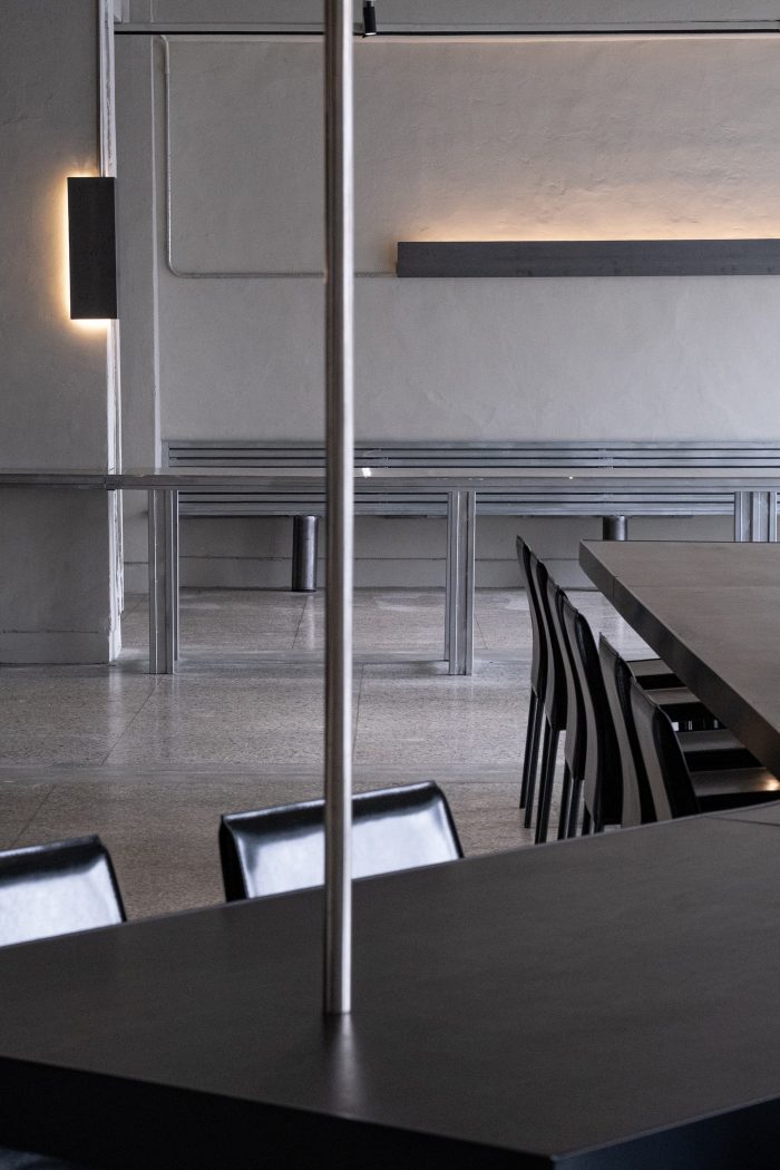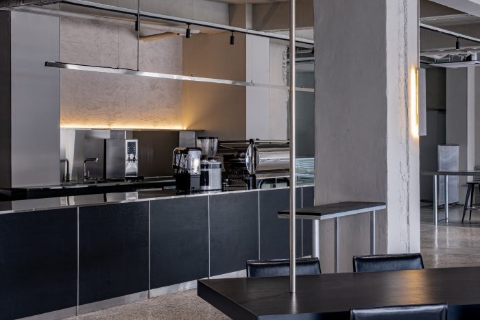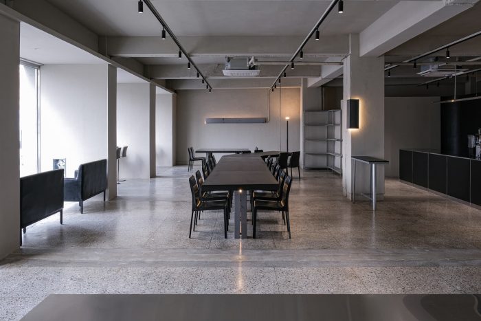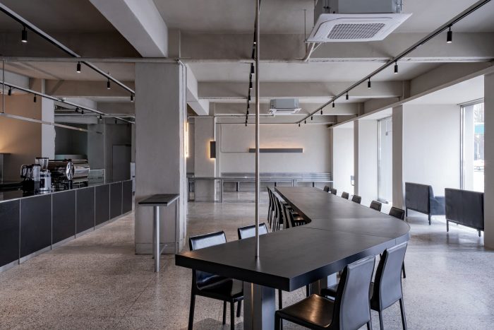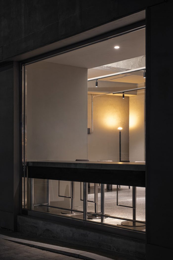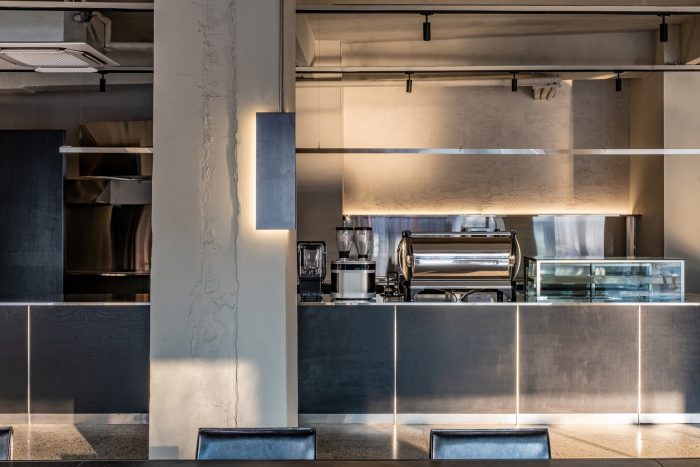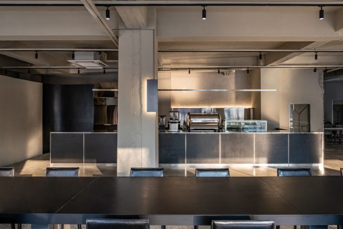The forms made following the function are simple but intuitive, composed of cold metallic properties and black wooden boards that press them heavily. Cement-colored terrazzo is a by-product of modernization that has been in place for a long time. The floor, which emits a soft light, reflects the light projected from the outside little by little and dyes the entire space.