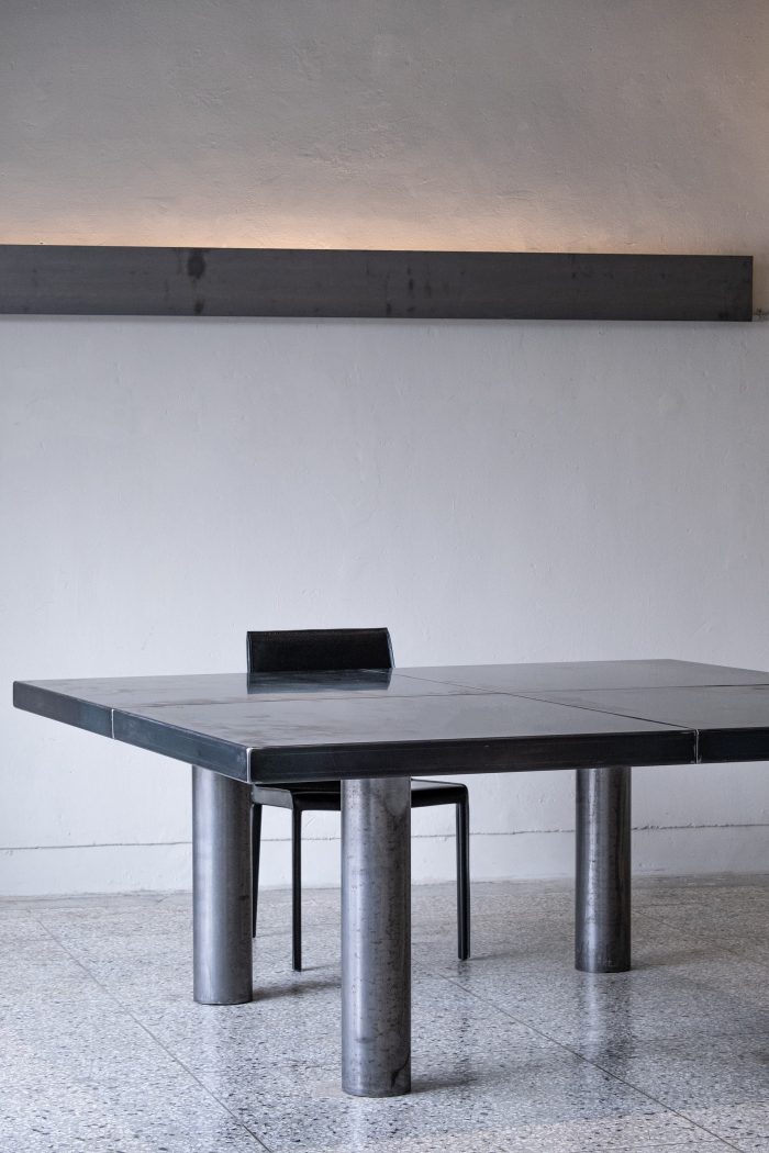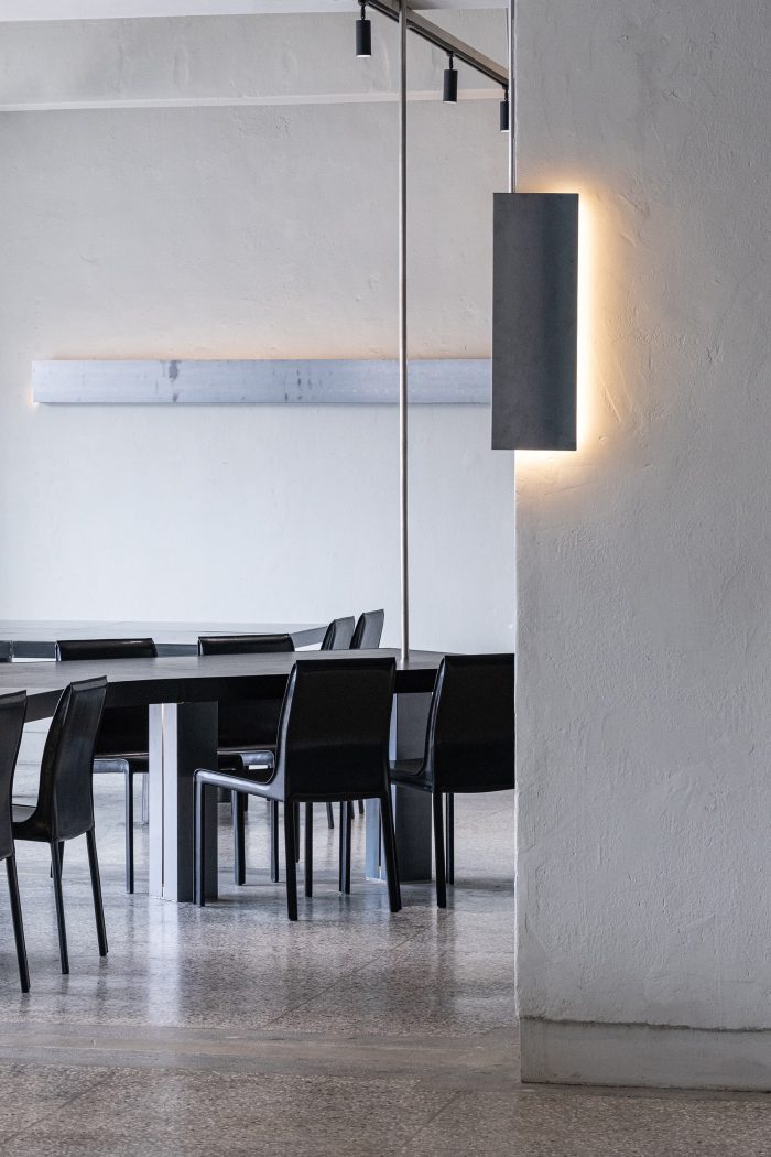 一张长桌作为一个巨大的物体存在。桌子的腿,也意味着摄像机的焦点,在缝隙中与光线建立了一个单一的线性图像。在这个空间里,人工照明使用了可以随时间腐蚀的铜板来表达痕迹之美。