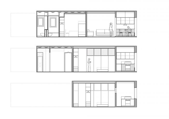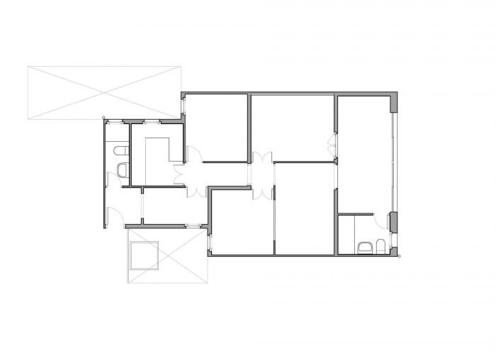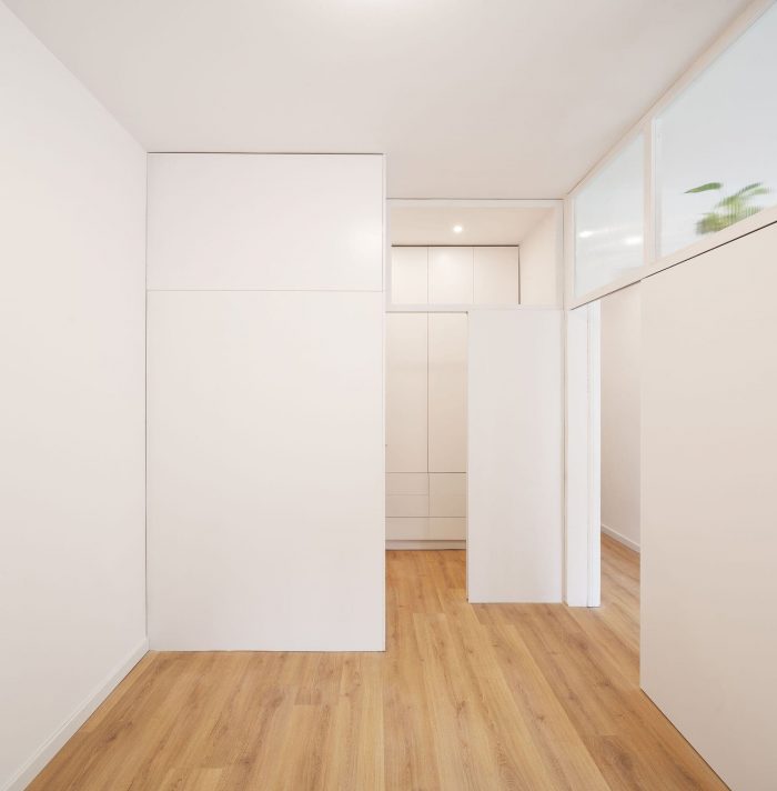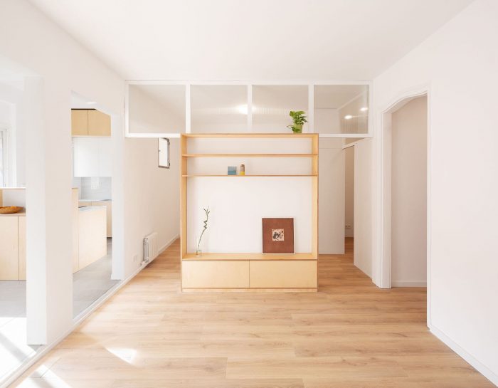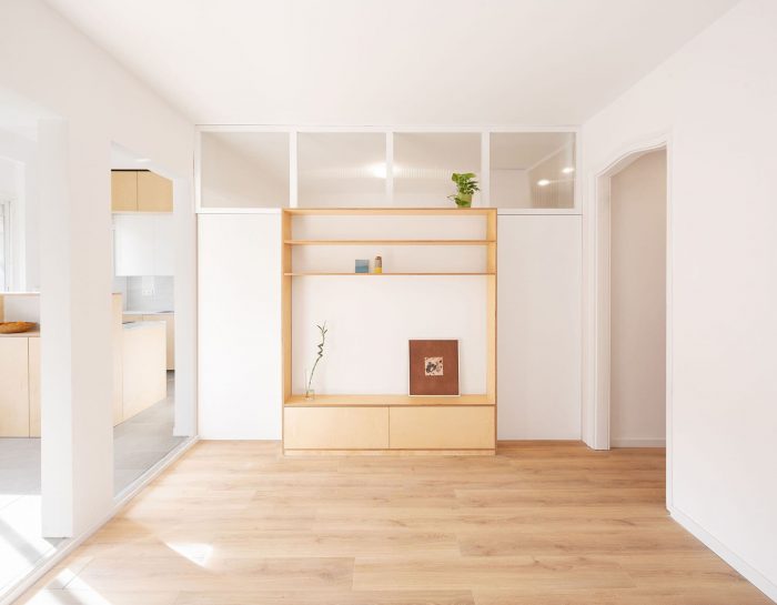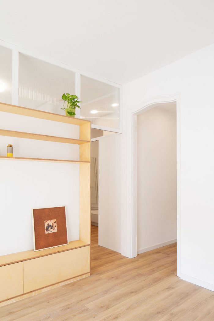The positions of the main bathroom and the kitchen, which is left open, are exchanged. The division between the living room and the master bedroom consists of a birch wood furniture with sliding doors and an upper glass panel, which allow to communicate both spaces in a fluid way.