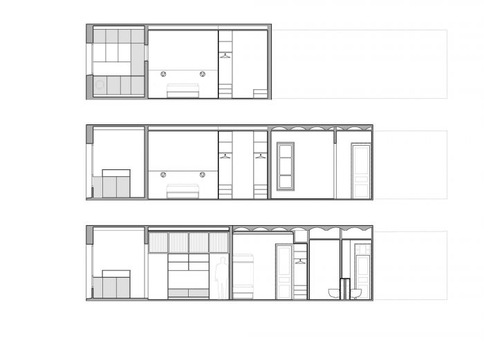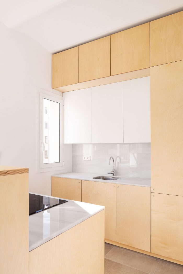 Several pieces of furniture are made for storage, dressing room and kitchen, combining birch plywood and white color. All of them simple furniture, but made to measure for each space. The uniformity of materials unifies and gives a sense of order to the whole.