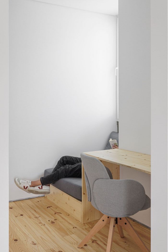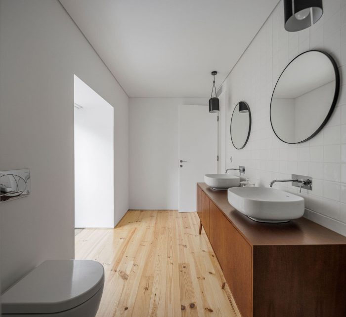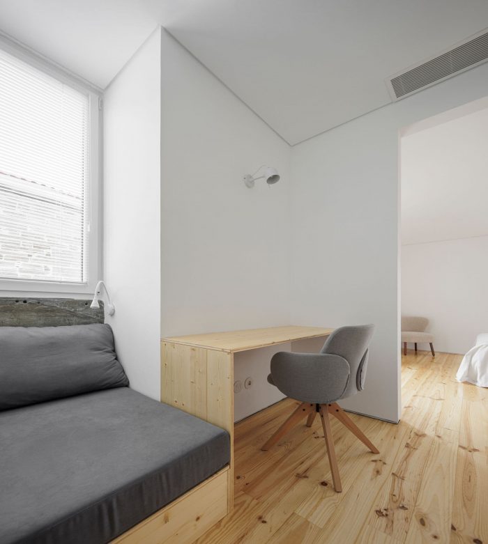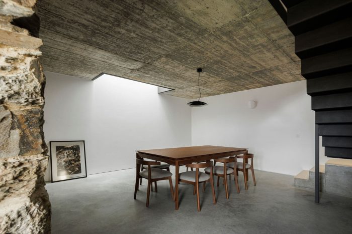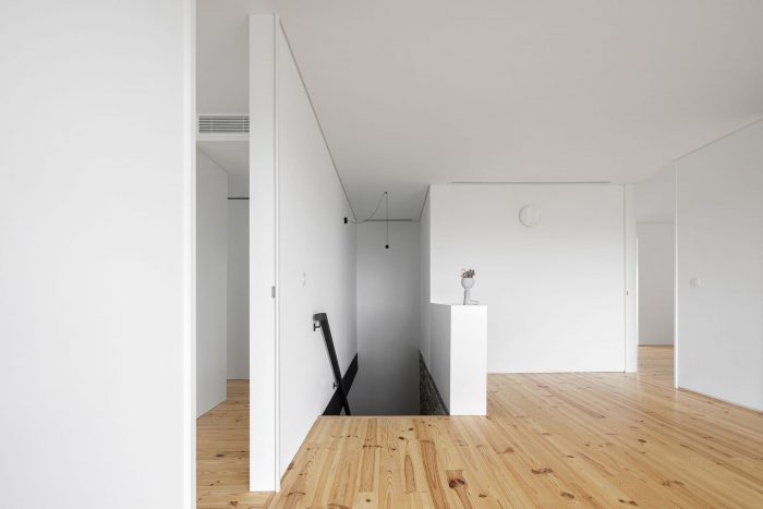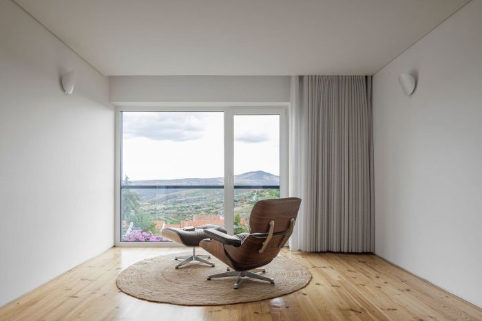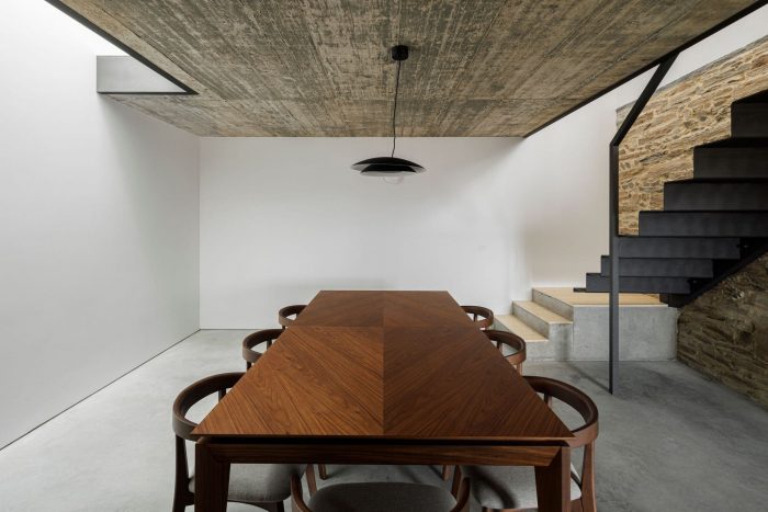 At the programmatic level, the dwelling is organized on two levels, the main access being made by the southern elevation at the level of floor 0. It is on this floor that the whole social area is distributed in a connected space, bounded only by the pre-existing inner walls, in shale masonry. On floor 1, the three-quarters are organized in a game of symmetries and rotations, where the meeting point culminates in a wide space for the natural landscape typical of the region.