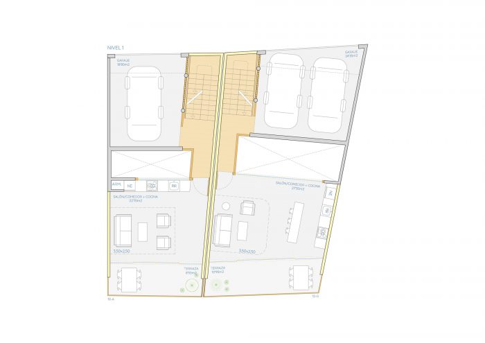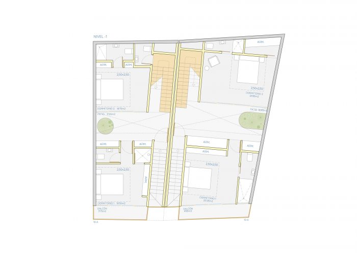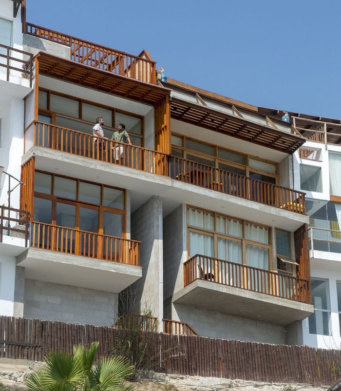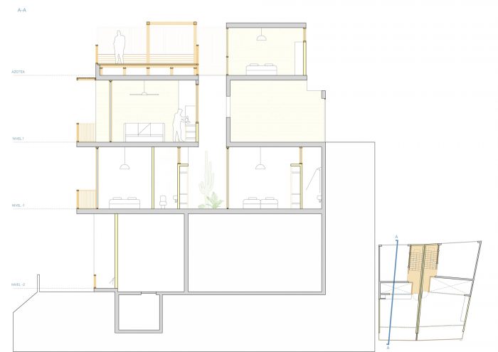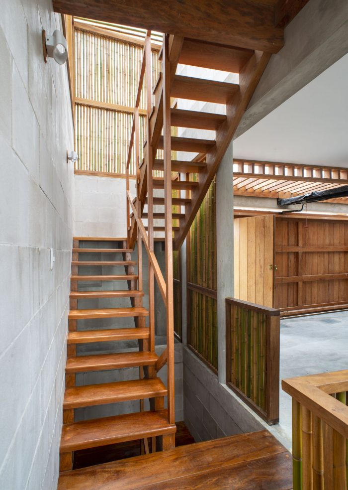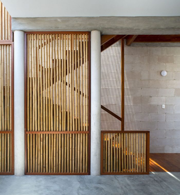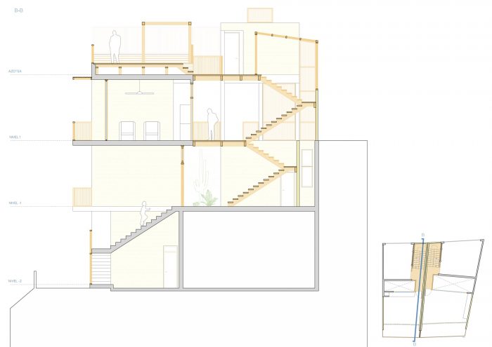 The two houses follow a compositional symmetry in the design, sharing the logic of the distribution on three levels, all of them with sound and spatial independence. The rooms are diaphanous and open, allowing flexibility of uses and promoting the daily use of outdoor spaces as an extension of them. They communicate through the patio on the lower level and with wooden walkways on the upper levels. The main materials are lime, bamboo, and wood, low-impact materials with resistance to the climate and local seismic movements. To optimize and speed up the construction, the use of lime blocks is selected, reinforced for the structural elements, and a simple system for the partition elements. Located on sandy terrain with a pronounced slope, the use of concrete has been minimized, limiting its use to the structure in contact with the ground.