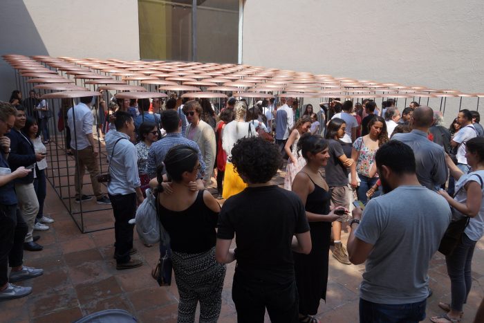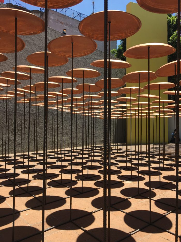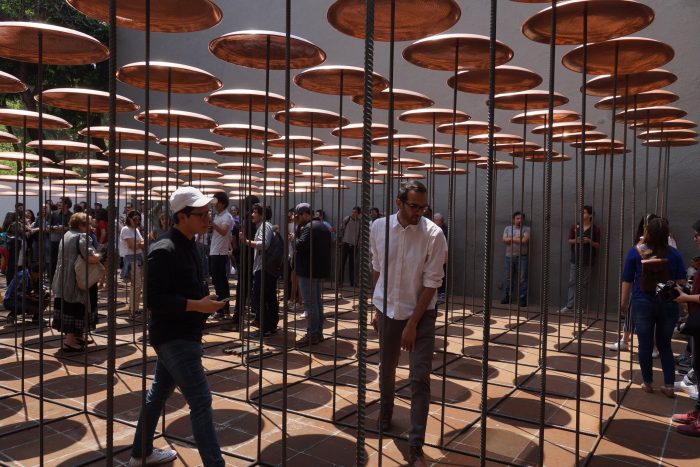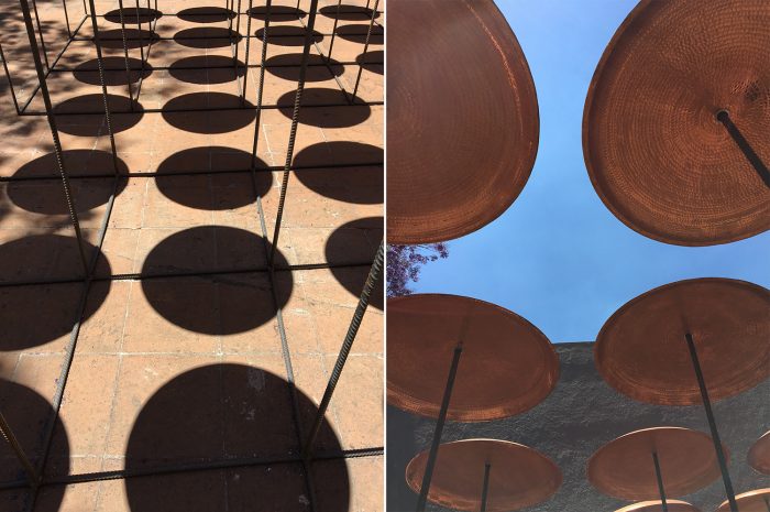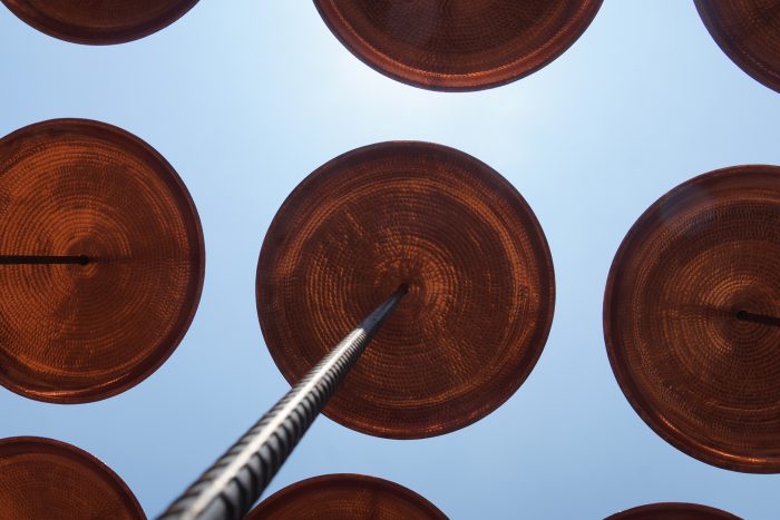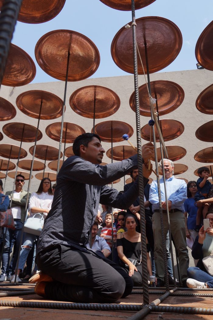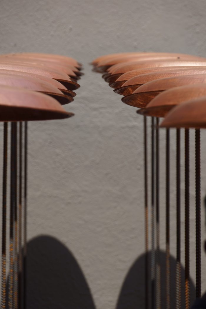 The space is constantly changing: due to its playful nature, visitors are invited to play the device and activate the sound space through the collision of 144 copper plates, as well as the shadows that form the transformation through it.