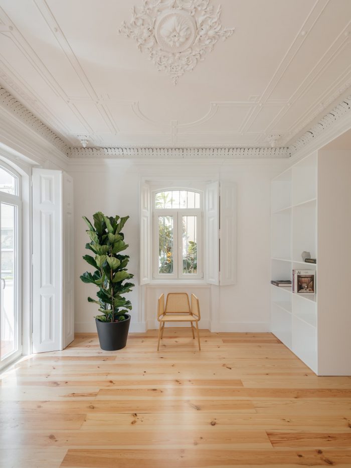 The purpose of the project was to enable an alteration that enhanced the existing one, namely the ceilings worked, the decorative frames between the ceiling and the walls, or the old crockery cabinets, thus managing to recover and establish a reading with new elements that emerge discreetly, but essentially such as the iron that reinforces the structure, the carpentry of right lines and others. With the necessary autonomy, the new design merges into the logic of the whole, of the house.
