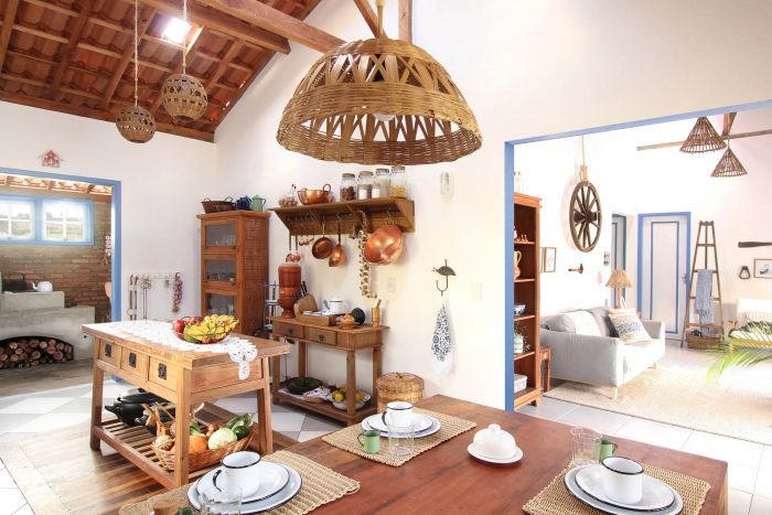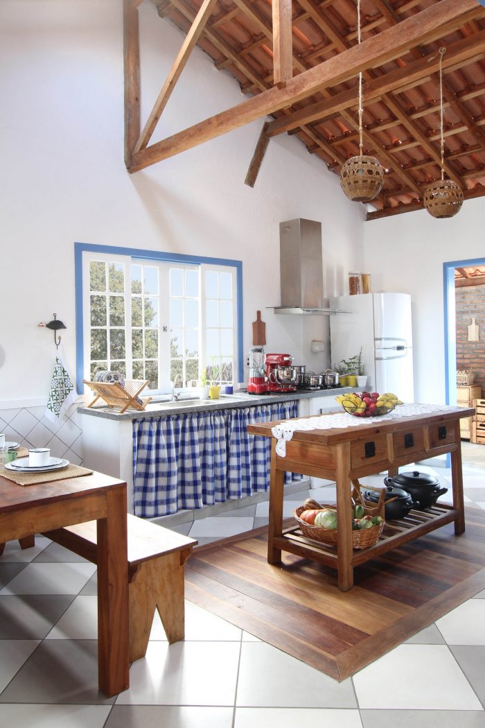 Living room, kitchen and wood stove communicate through large openings. In the kitchen - the heart of the mineira house - there is a table for the whole family and a support island to help in the preparation of food. On the walls, dishes and pans were organized for easy handling. In general, all the exposed items contribute to the "mineiro decor". They are traditional pieces that are in fact used on a daily basis.