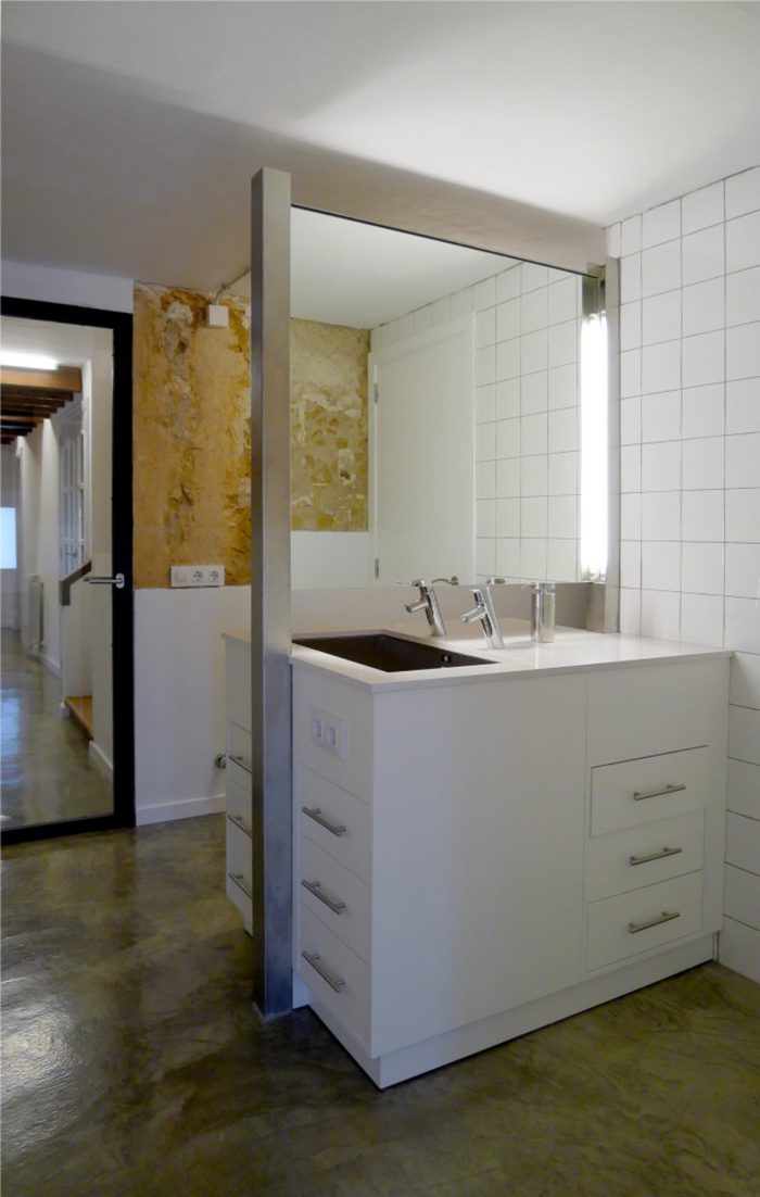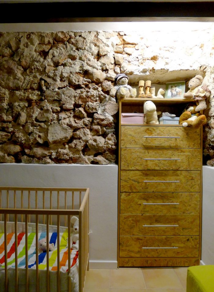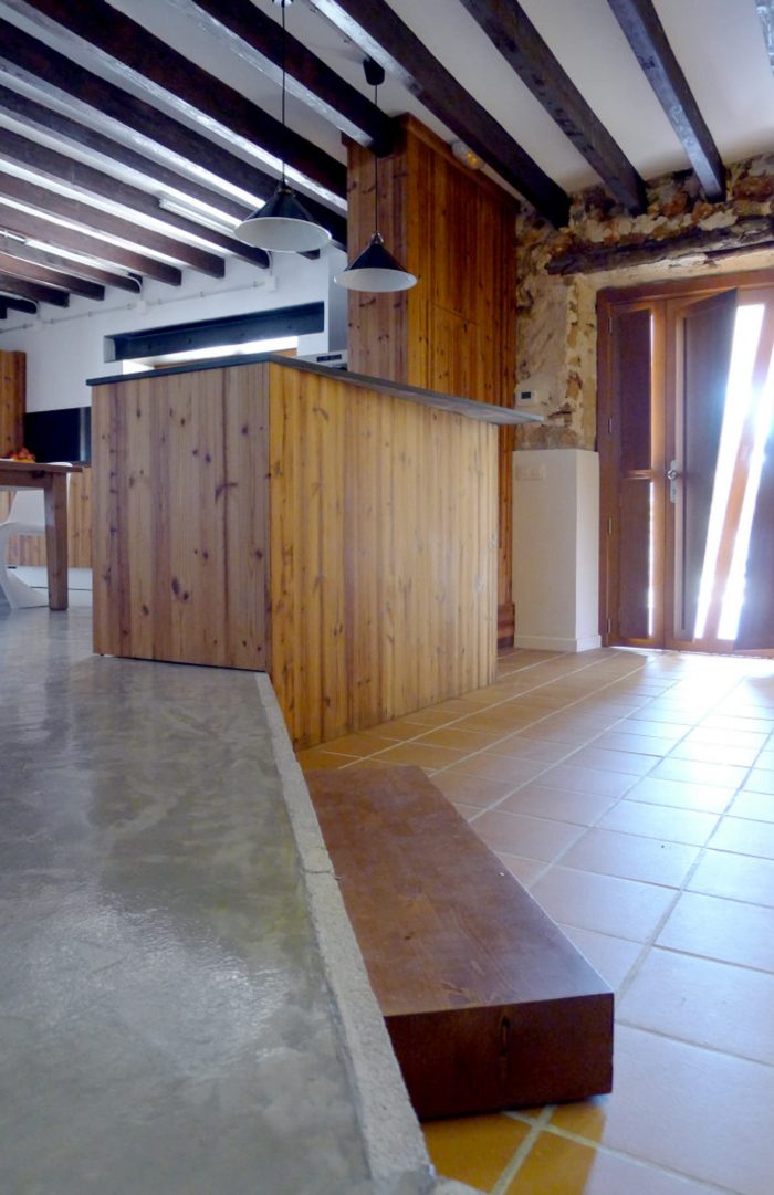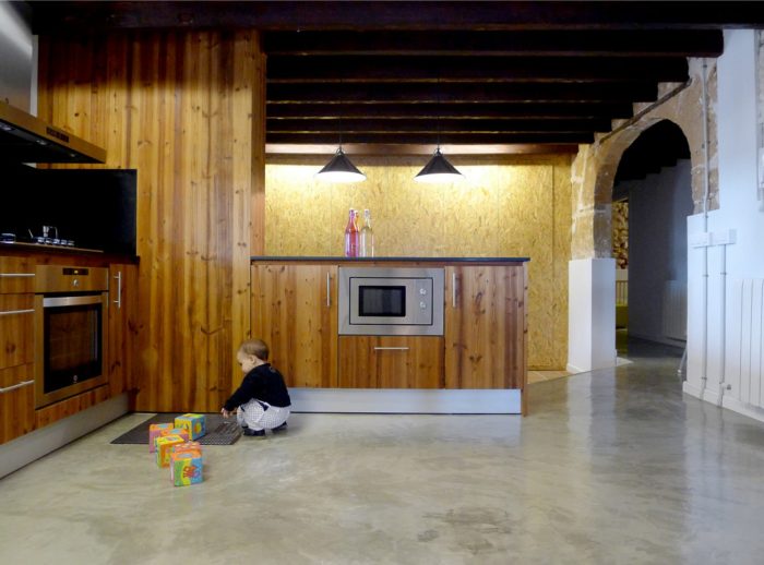 Thus the original building warmth transmitted by the walls of Mares (local sandstone), the facades of stone with mud and the pine beams enter in symphony with the OSB panel wardrobes, the kitchen roasted ash with the black silestone stove top, with the multi-layer board racks, the continuous concrete floor and its concrete blocks curb and the draining mortar sills that allow the wall breathe while preventing their deterioration by weathering.