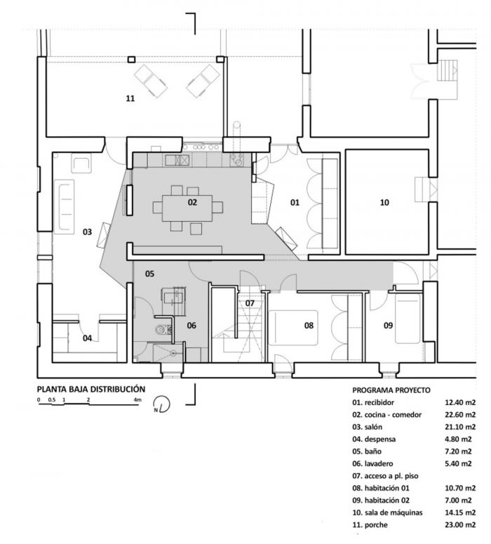 The Kitchen – dining room as a control room is opened to the other rooms in the house (hall, bedrooms, living room and porch) and establishes a level of use simplifying the original slopes with a uniform technical ground. This Technical floor acts with the flexibility of a carpet, ranging freely between the original rooms establishing new paths, such as linking the kitchen – dining room with the bath – laundry through a “balcony” to the living room.