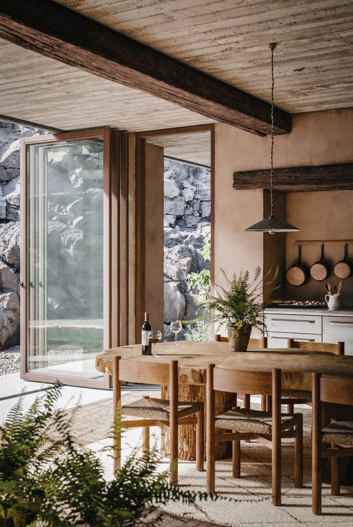The guesthouse paves a luring subterranean tunnel which leads to a purely proportioned wine cellar. Carved from beneath the rocks, this burgundy vaulted cube is lit by a circular skylight, and hosts an elemental and synesthetic ambiance. A primitive silence with solemn lighting, pairs intuitively well with the cool and moist air which smells of toast, oats and musk.