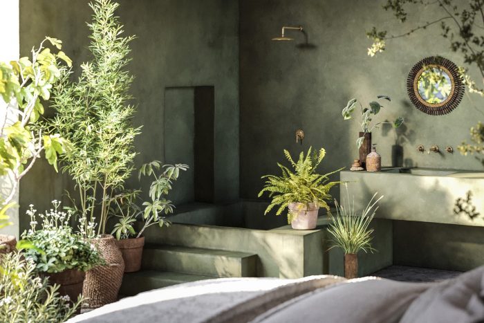 Wandering along the glazed façade over to the neighboring bedroom and bathroom, one is greeted with a sunny and generously green space. Pure slabs accented with niches and lush plants are embraced by laurel green tadelakt walls, orchestrating a sensual experience of bathing in the outdoors.