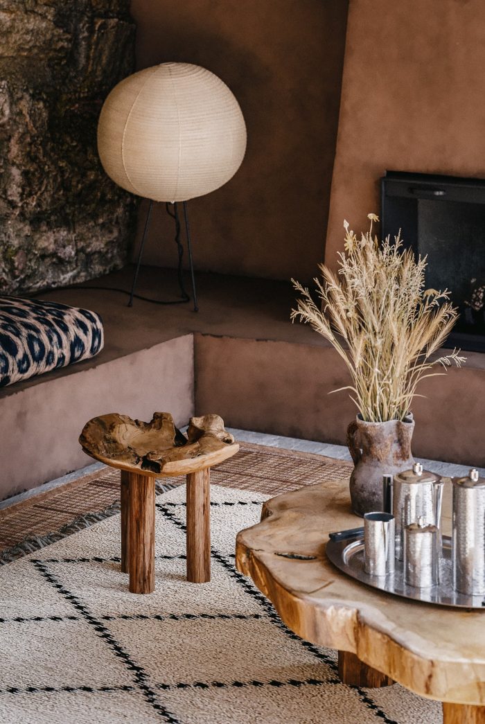 In the living room, a humble fireplace claims center stage beneath the cast in place concrete ceiling and old reclaimed timber beams. The furniture conducts a primal instinct with its layered assortment of oriental patterned fabrics from leopard print seats to Moroccan rugs. With a rustic nature and a conveniently functional size, the kitchen invites warm and intimate gatherings around the thick slab of eucalyptus wood.