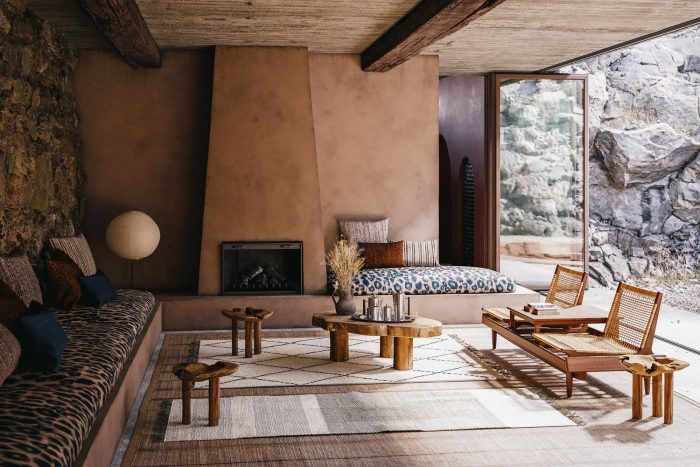在客厅里,一个简陋的壁炉在现浇混凝土天花板和旧的再生木梁下占据了中心位置。家具以其分层的东方图案织物,从豹纹座椅到摩洛哥地毯,传导着一种原始的本能。厨房具有质朴的性质和便利的功能尺寸,邀请人们在厚厚的桉树板周围进行温暖而亲密的聚会。