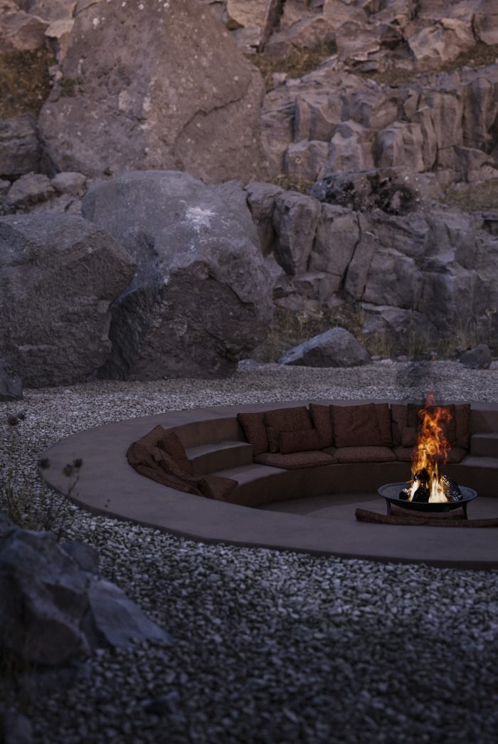 A secluded circular fire pit sits at the foot of the massive rocky formation. Flames dramatically dance against these colossal rocks and distant mountains, hosting enchanting evenings and ceremonies. This pleasantly somber and lunar refuge makes way for spiritually stimulating celebrations under a vast starry sky.