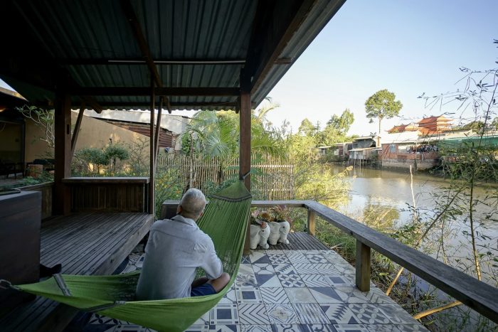The Second Bird's Nest: Since the olden days, the way people in the Mekong Delta build their homes is almost similar to that of a bird building a nest: gathering materials from the surroundings - the wood, clay, husk and coconut leaves. Furniture and houseware are also made from bamboo and rattan. A traditional house itself, therefore, becomes an impressive living museum with daily activities exposing a bold culture. The idea of the “bird's nest” is also an idea we’re given by the owner himself. After a long time living in the city, staying in a nice little "nest" built and adjusted over the years, he decided to sell the house and move back to his hometown to live near his family. The whole house’s wooden structure is reused from the frame of an old local house. Much of the old nest's furniture is reused in the new nest. After the main wooden parts of the house were finished, the leftover wood was used to assemble a stilt hut by the river. He wishes to build a gentle house in the spirit of reusing much of what is already around.