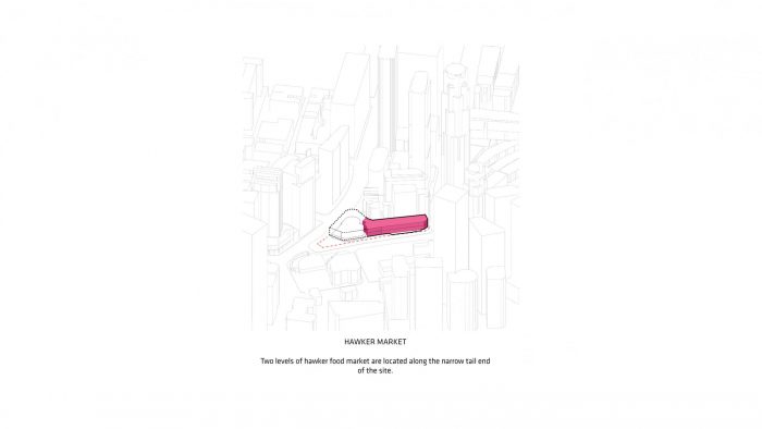 蜿蜒的花园小径创造了进入城市房间的自然入口,这是一个位于塔楼脚下的18米高的宽敞的开放空间,它为热带阳光和阵雨提供了庇护,欢迎租户进入办公室和住宅的独立大厅,也欢迎购物者和用餐者进入塔楼裙楼内的食品中心。标志性的市场街小贩中心在大楼的第二和第三层被重新打造,有56个食品摊位--巩固了该地点作为城市美食体验的跳动中心,以及它在维护当地文化和社区方面所发挥的作用。