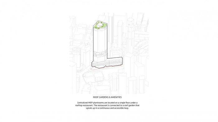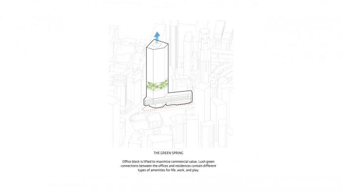 该项目位于新加坡金融区的中心地带,原是一个公共停车场和一个小贩中心,这栋9.3万平方米的混合用途高层建筑由正交线、郁郁葱葱的绿色植物和对比强烈的纹理的动态交织而定义。