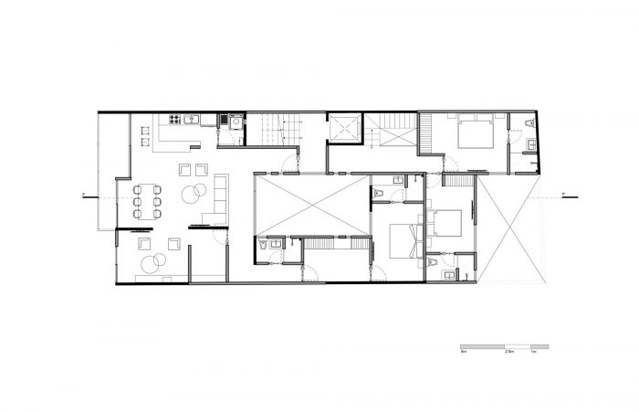 该建筑包括5个公寓单元,3个面向外部,2个内部联排别墅,有私人露台。