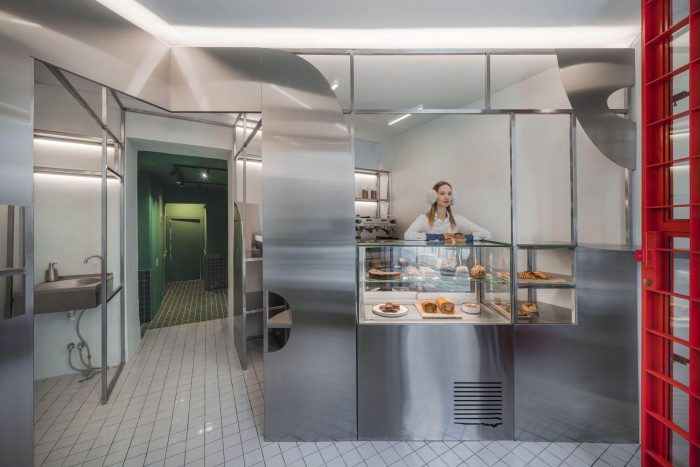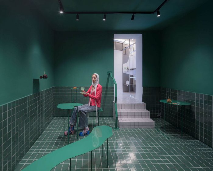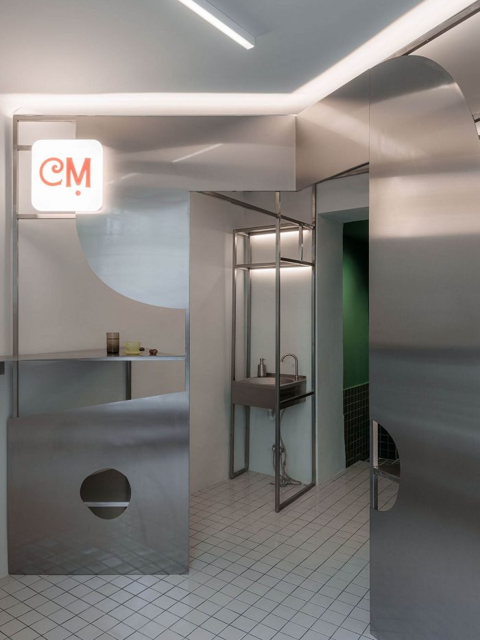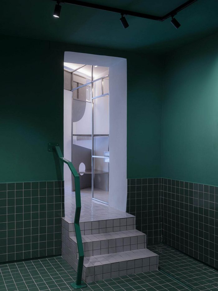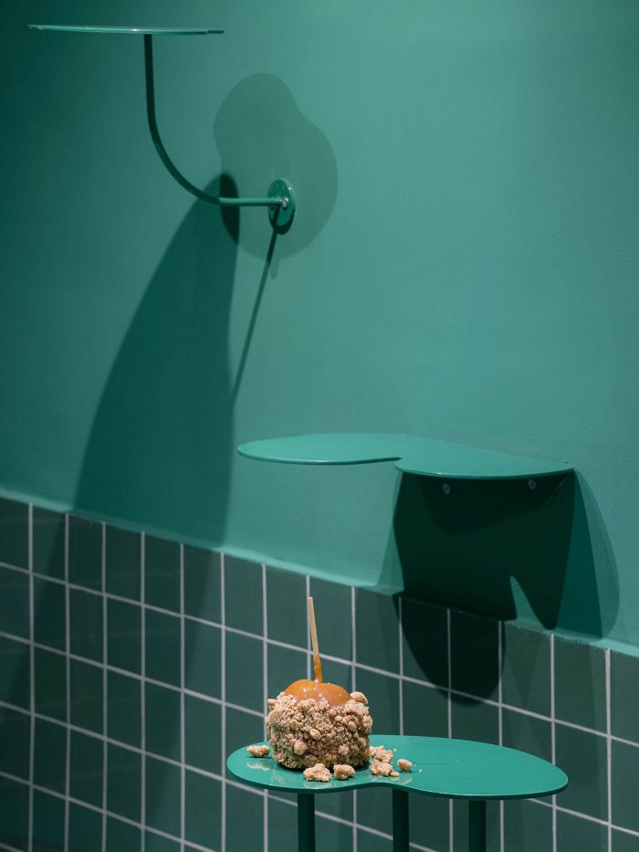 然后,惊喜出现了:第二个空间--例子--放松和扩大了。在这里,颜色似乎创造了它自己的焦糖形状的宇宙,家具再次展开整个空间,赋予它各种功能,如展览、座位或桌子。这些形式漂浮在这个单色空间中,就像在两个不同材质的空隙(上方和下方)之间画出的甜美笔触。沉浸在这片绿色瓷砖的海洋中,一个红点吸引了我们的注意力:通过这个透明的窗口,我们观察到我们的客户在厨房的日常工作中的工艺。