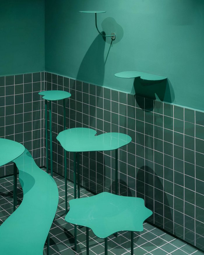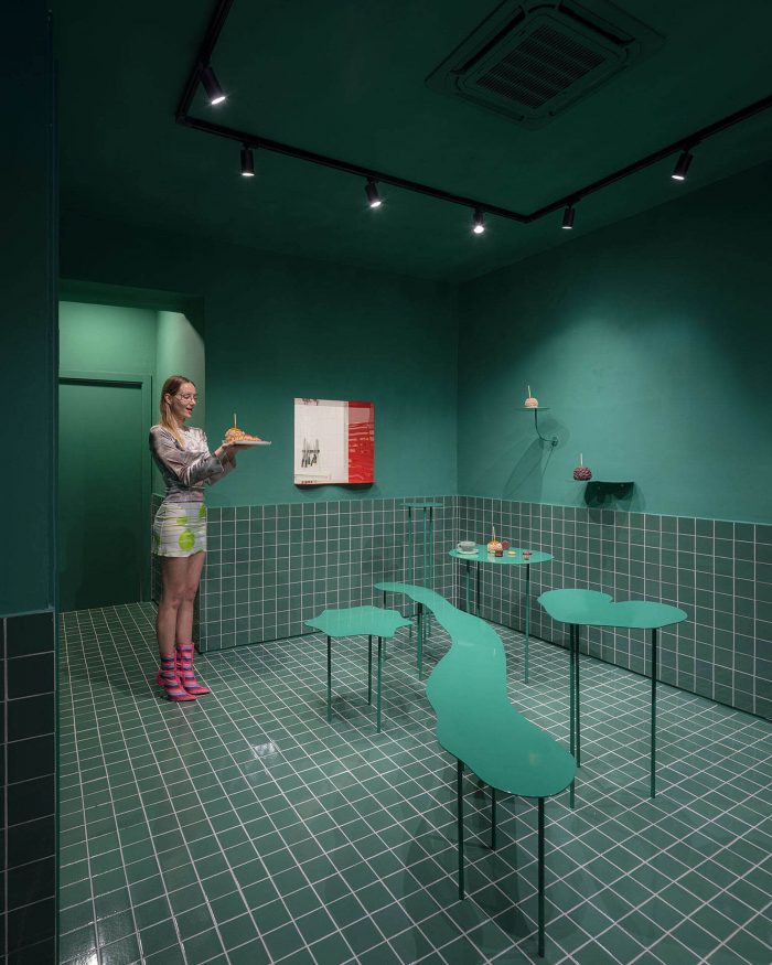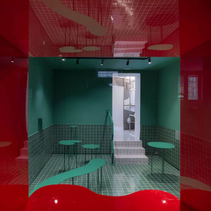 Then the surprise appears: the second space -ample- that relaxes and expands. Here color appears to create its own universe of caramelized shapes, furniture that once again unfolds throughout the space, endowing it with various functions, such as an exhibition, a seat, or a table. The forms float in this monochrome space, like sweet brushstrokes that are drawn between the two voids (above and below) of different materiality. Immersed in this sea of green tiles, a red dot captures our attention: the transparent window through which we observe the craftsmanship that our clients do in their daily tasks in the kitchen.