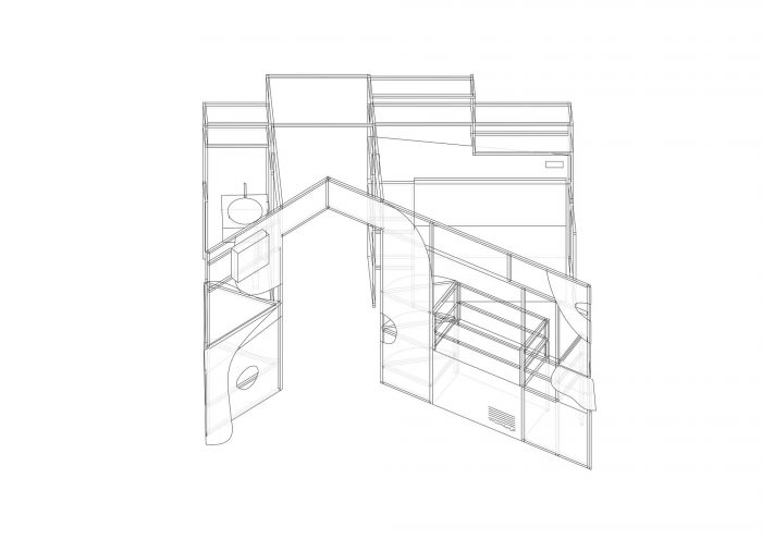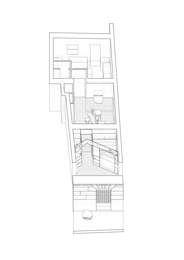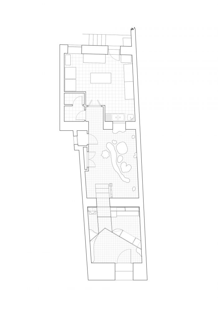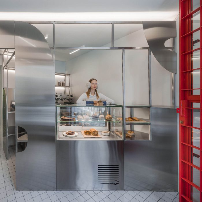 At 20 Trafalgar Street, near Plaza de Olavide, in the Chamberí neighborhood of Madrid, this small specialized pastry shop is located. The architectural project works with two opposing spatial operations that we have called systole and diastole, which face and confront each other. The first space is white, small and contracted, made up of an equipped piece of furniture that receives the visitors and meets all the needs of the clients. This artifact folds and takes multiple forms. It could be said that it is a counter, but it is also a bar, a warehouse, a refrigerator, an oven, a cash register, a shelf, a garbage can, a coffee maker, a grinder, and a sink. This space is so small that it becomes a kind of interior facade that invites and spills into the next room.