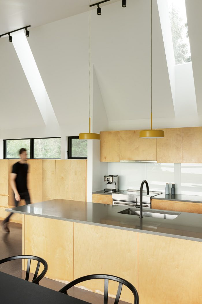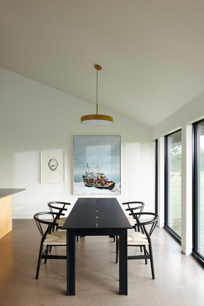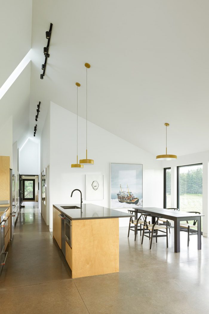 The building is designed to sit proudly in the rustic landscape with natural materials, resistant to the harsh Atlantic climate. The modesty of the 20-foot wide building with exposed concrete floors and custom natural wood millwork carries the natural landscape and beauty throughout the house.