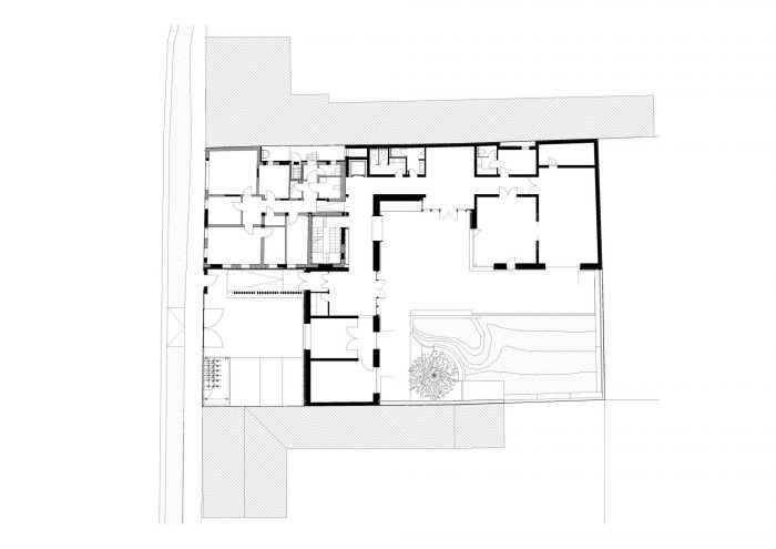 The lot was built in with an L-shaped building complex placing the reception (welcoming area) on the ground floor and in the wing the requested functions. We created a little front garden to the street front so there is a square paved space in front of the entrance. Thanks to this solution the entrance of the building is spacious and spectacular. The covered pedestrian entrance creates an axis that runs through the whole building and it connects the public, exterior part with the intimate, interior garden.