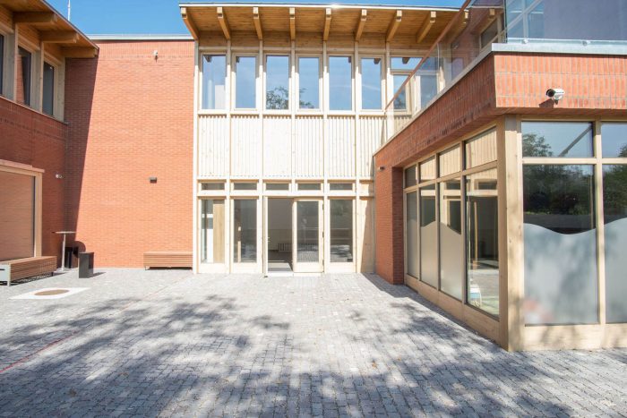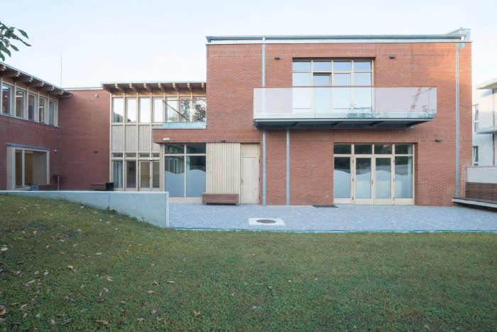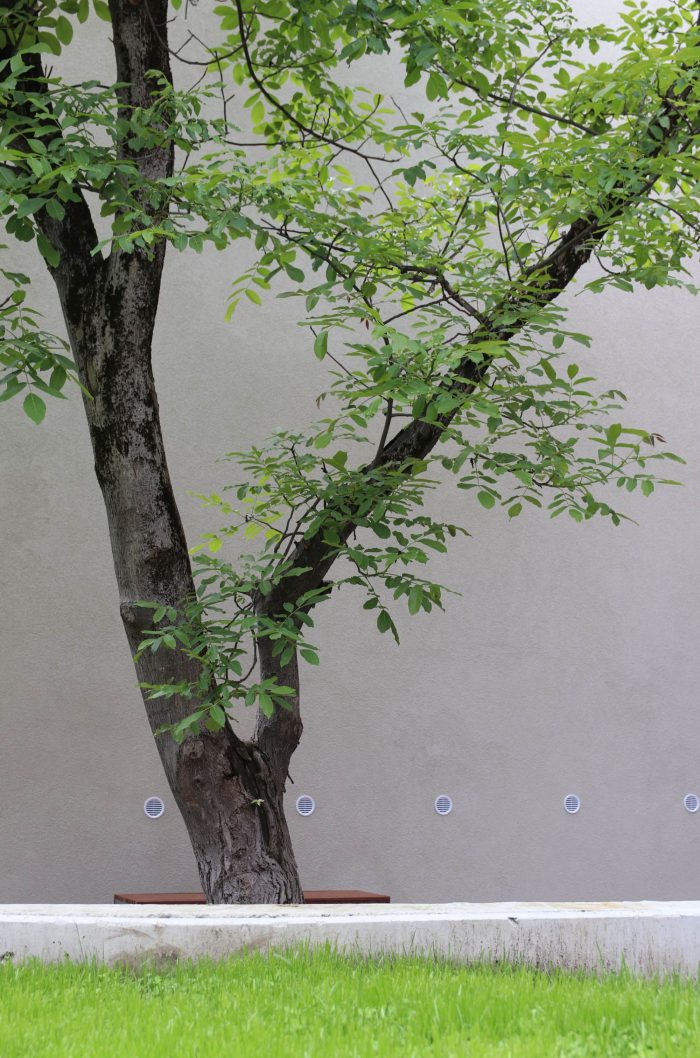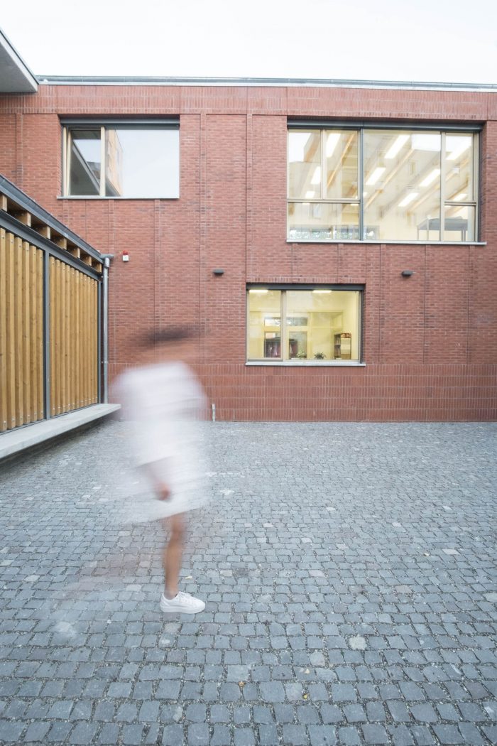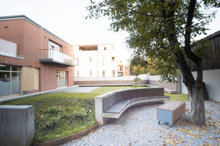 The building partially surrounds an interior, closed garden. The extending was conceived in such a way to assure the garden maximal natural light and sunshine. The ground yard was dreamt to be a covered space with movable garden furniture and an artificial earth heap. The upstairs terraces interspear the facade. This way the big lecture hall has a pleasant view of the ground floor garden.
