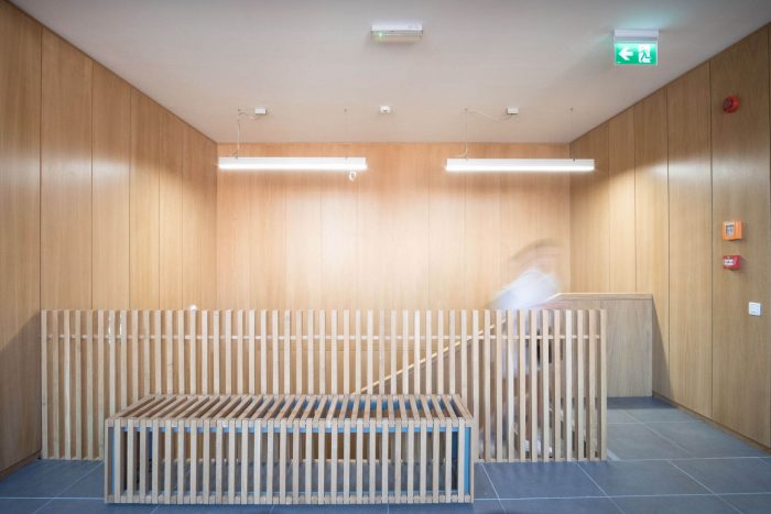 对于内院的人行道来说,最大的效用是一个重要问题。出于这个原因,地面部分是用立方体铺设的。我们在中间使用大的立方体和较宽的灌浆(因此植物和草可以很容易地生长),而在建筑物旁边,我们计划使用较小的立方体和封闭组。就内部空间而言,一个重要的问题是统一材料的使用,即赋予温暖和色彩的橡木贴面。演讲厅的分层木质框架为这个空间提供了节奏和隔断。