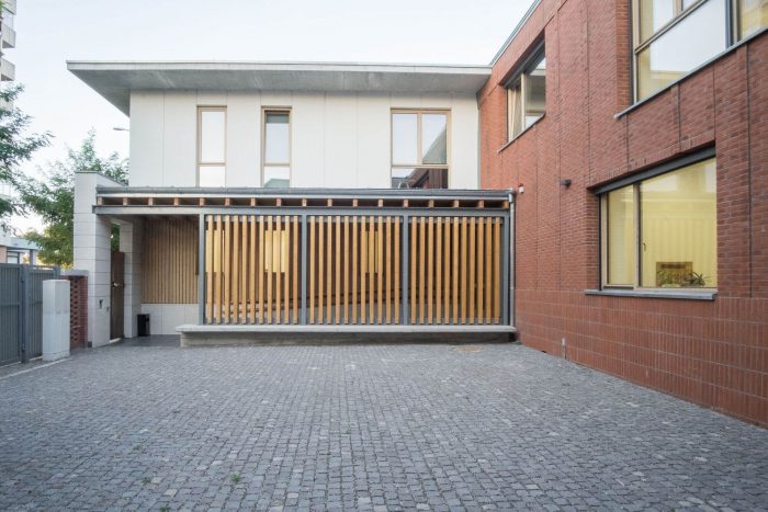 Local regulations made it possible to use infills. Thus we closed the existing building on the street front until the neighbour site as if it had an interior and exterior brick coat. The proportioning of the main facade seems to be a mould at the set back. The new proportion was drawn back from the street front plane, thus we created an urban front-yard serving as a future parking lot for vehicles, bikes, and pedestrian entrance.