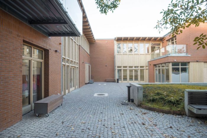 该建筑部分包围了一个封闭的内部花园。扩建的设想是为了保证花园有最大的自然光和阳光。地面院子被梦想成一个有盖的空间,有可移动的花园家具和一个人造土堆。楼上的梯田与外墙相接。这样一来,大讲堂就能看到底层花园的愉快景色。