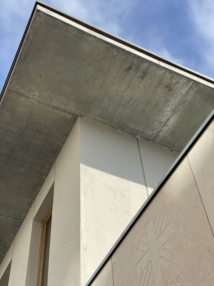 In choosing the material we kept in mind: the materials of the existing building; in defining the character of the building we tried to use traditional construction materials; the building's future sustainability; to use such materials and solutions that are modern and will last in time. We decided to use for the existing building a vertically fluted, eggshell color plastered surface that is closed by a charismatic concrete ledge. In the case of the new parts, we designed rough brick coverage and wooden filling.
