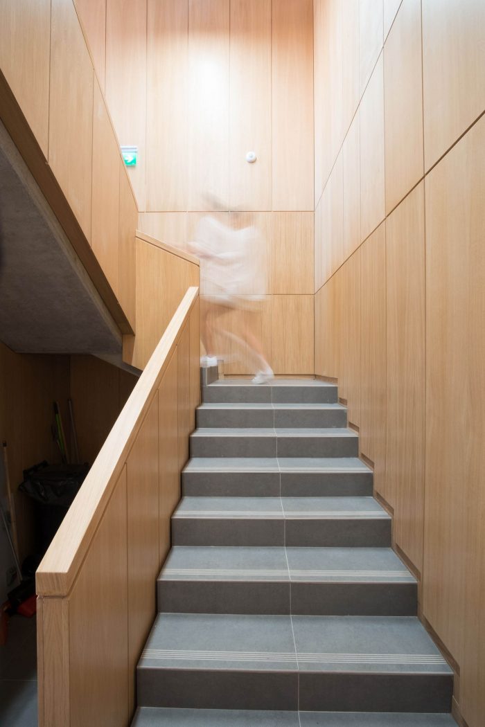 The reception, the welcoming area of the ground floor represents a transition between the outside world and the protected interior space. It works as an agora, the building communicates through it with the outside world. The stairs and the elevator can be accessed from the entrance area that brings up to the upper floor functions.