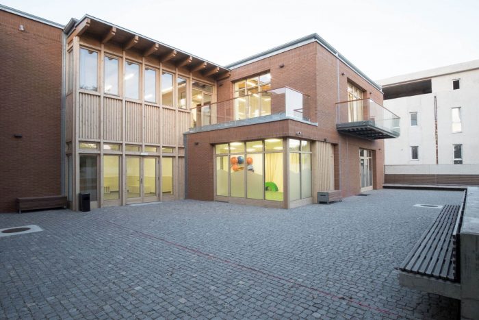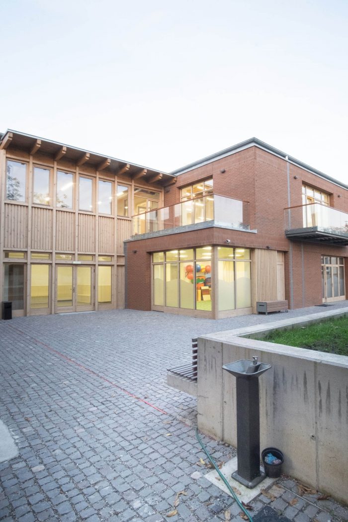 两层楼都有洗手间。底层的房间可以直接通往花园,而上层的明爱学校和大讲堂有自己的露台。底层有婴儿室,以及运动能力室和医务室,而上层则有办公室、明爱学校和一个大容量的多功能报告厅。在多功能厅的旁边,有一个小型的咖啡区,专门为同事、客人和所有活动的参与者服务。咖啡区只能用于准备计划活动的必需品(客人、项目参与者),对于学院来说,它提供了吃点心的空间。