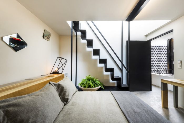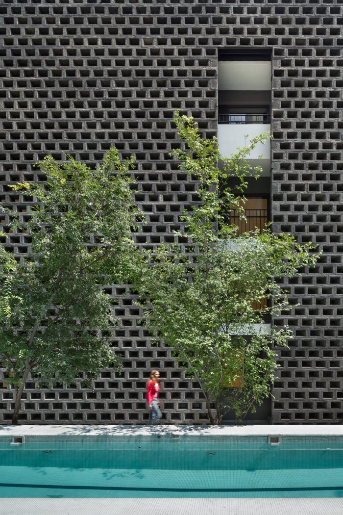 The lattice of black concrete blocks is connected with these objectives of spatial relations, but also provides privacy and enriches the journey to the rooms. These have a living condition inside that depends on the guest, some even have private roof terraces to sunbathe and enjoy the vertical urban landscape of Mexico City.