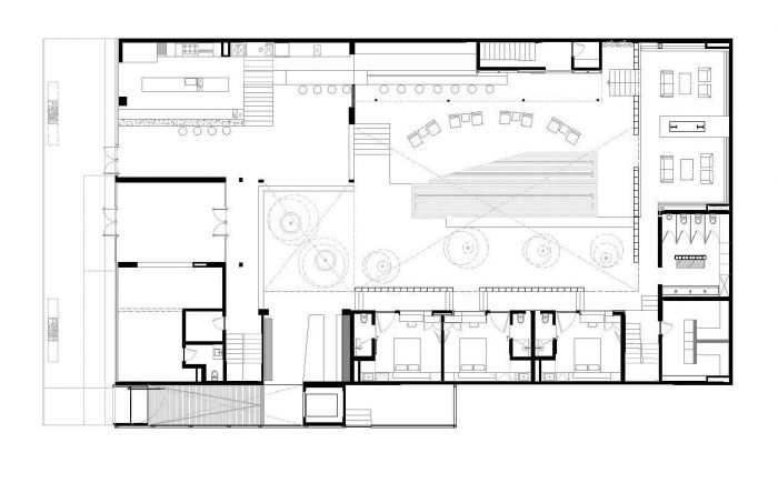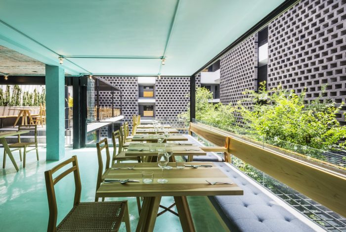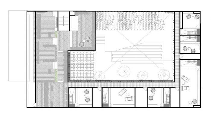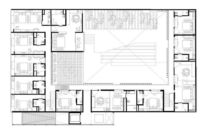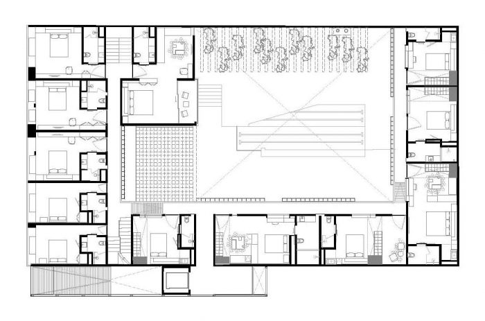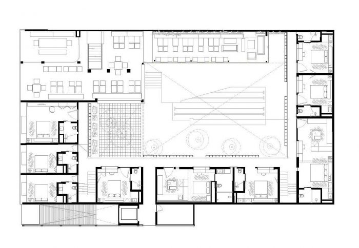 The central courtyard becomes the busiest public space, the restaurant, which is designed under the same criteria of the hotel. The shop / gallery and library spaces are integrated with each other, they break the boundaries between them and create the feeling of no limits defining them independently; the library has a cozy enclosure through the atmosphere and furniture.