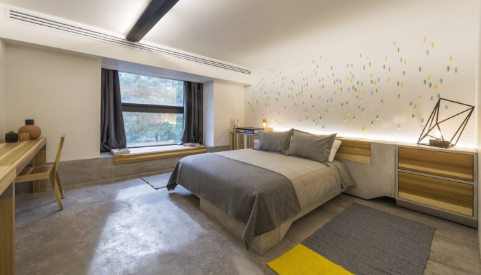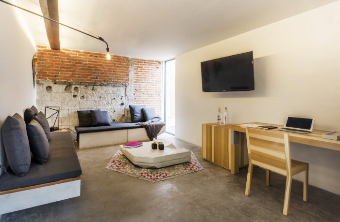 The interiors are done in collaboration with a team of Mexican designers who took care of every detail of the spaces, from concrete furniture with inlaid custom wood and lighting fixtures, even the bathroom fixtures, producing each piece according to each room. Contemporary art interventions cover some walls of the rooms giving a touch of color and creating a unique spatial experience.