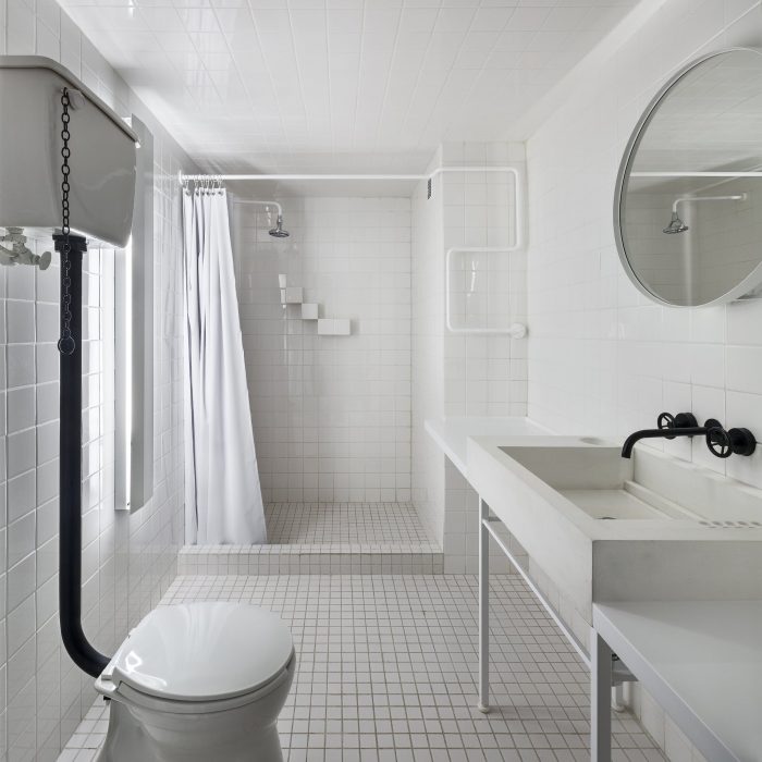 We even decided to prevent access on the facade and build a new one on the side, in the neighboring parking lot to change the narrative of circulation and cause a surprise making visitors come in directly to this central courtyard that we had idealized in the photographs. In the process, in addition to removing and showing the different layers, we also decided to provide some powerful elements that could give cohesion and unity to the project. The concrete structure of the existing building can be seen in every common area and hotel room.