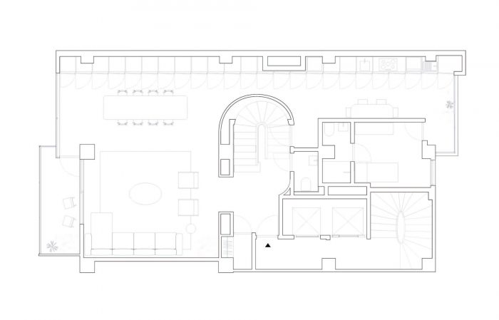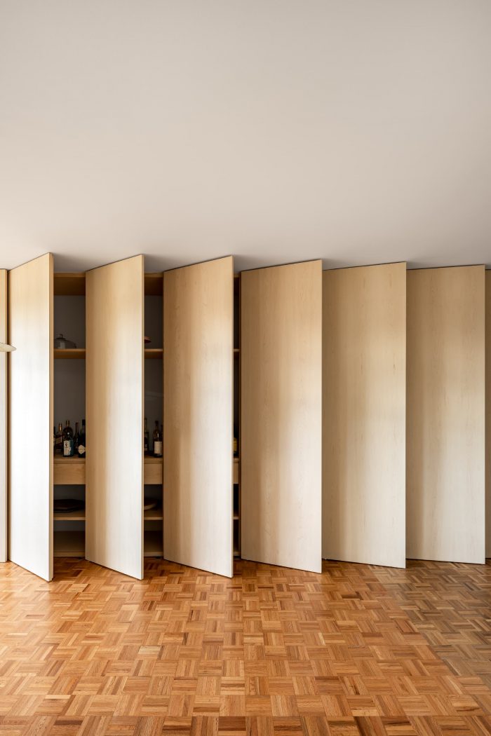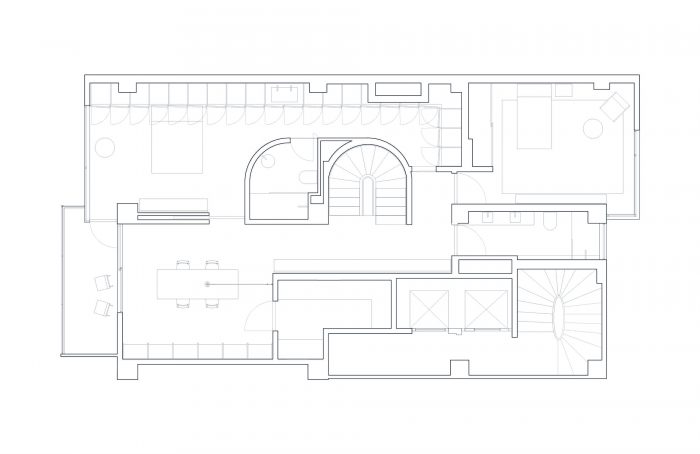 The original architecture is stripped of unnecessary elements such as dividing walls, false ceilings, and decorations, thus achieving large open spaces. A series of curved walls separate, while at the same time connecting rooms with each other, through a new open plan scheme with thin corridors between the different functions of the house, such as between the kitchen and the dining room; or between the bedroom and the bathroom.