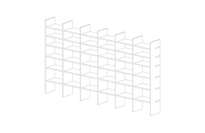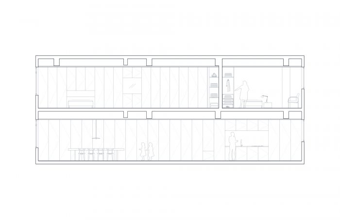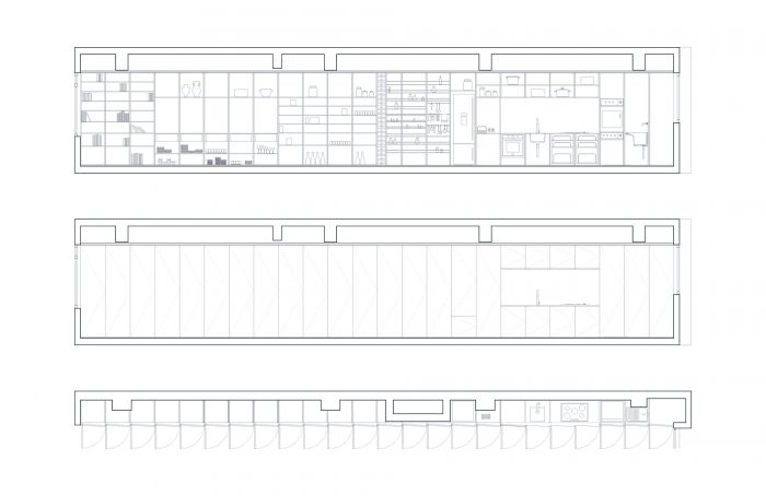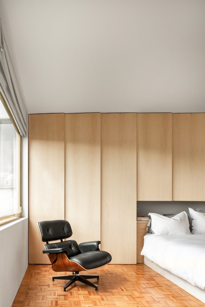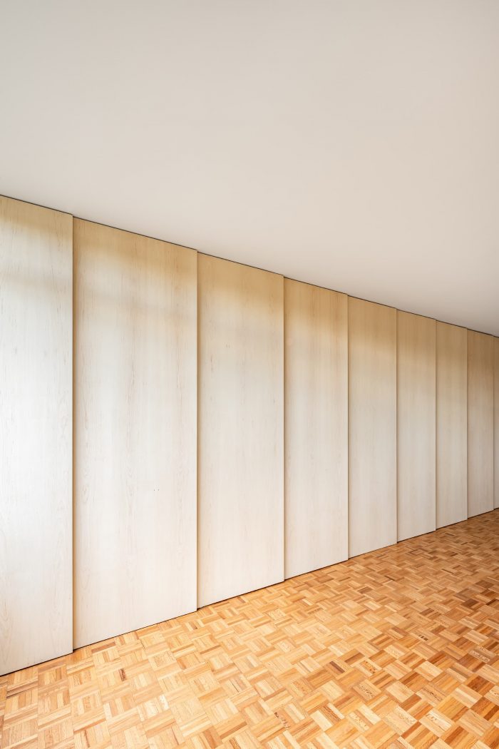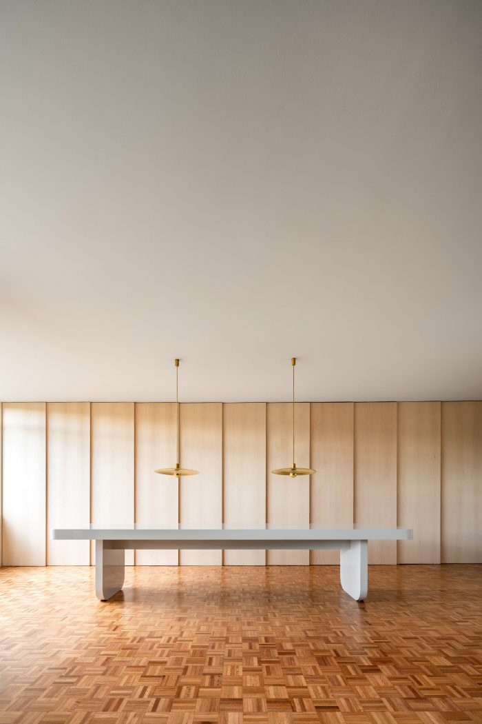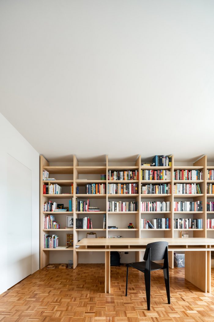 The delimiting element on both levels is a 17-meter-long accessible wall, which occupies the entire length of the floor plan. Overlapping doors along these walls allow easy access for storage, while also serving as a kitchen, open bathroom, and dressing room. A series of fixed and loose furniture elements have been custom-designed by Zeller & Moye: a four-meter long table with a high-gloss lacquered finish, a natural wood table for the study, brass pendant lights, among others.