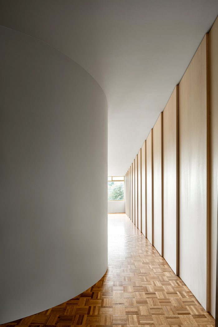 原有的建筑被剥离了不必要的元素,如隔断墙、假天花板和装饰物,从而实现了大的开放空间。一系列弯曲的墙体将房间分隔开来,同时又通过一个新的开放式方案将房间与房间之间连接起来,在房子的不同功能之间有细长的走廊,如厨房与餐厅之间,或卧室与浴室之间。