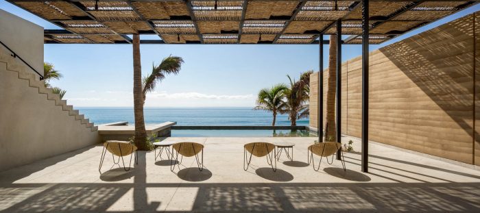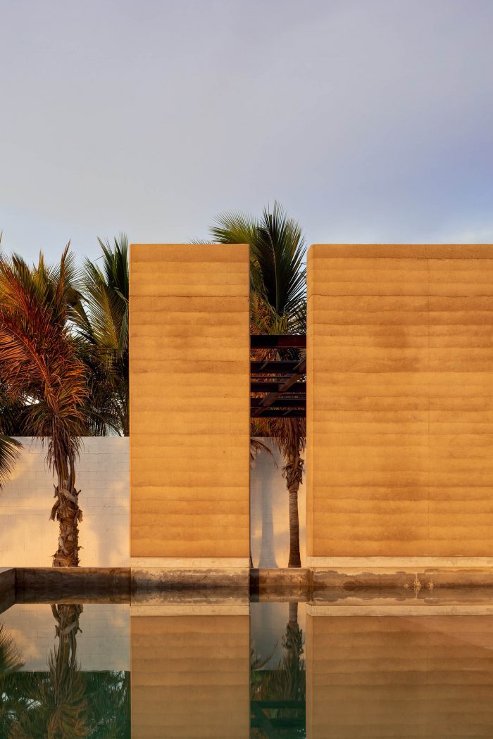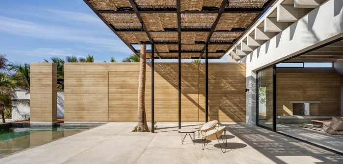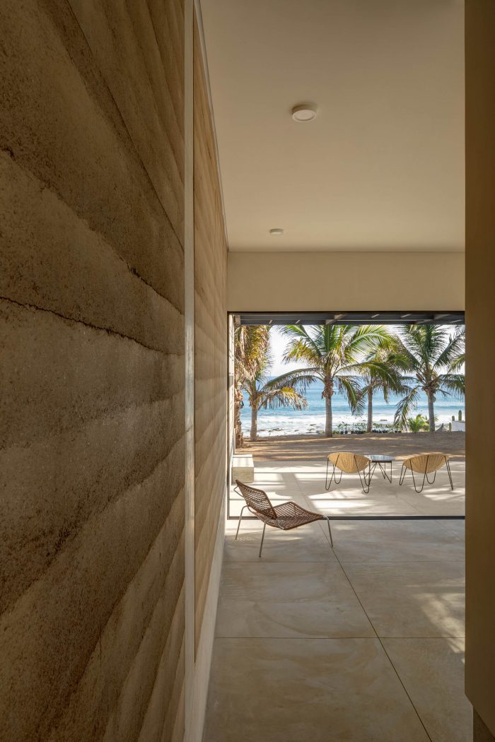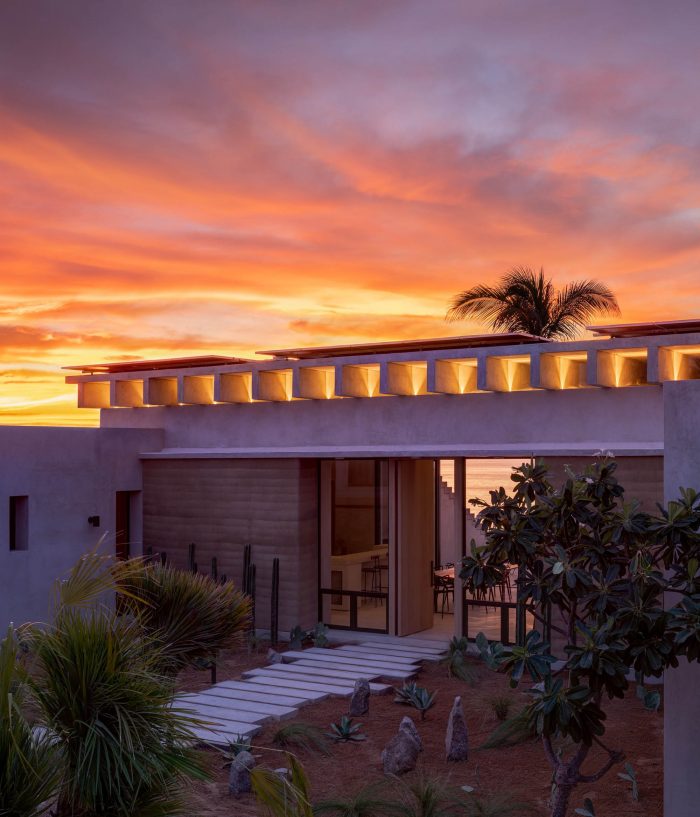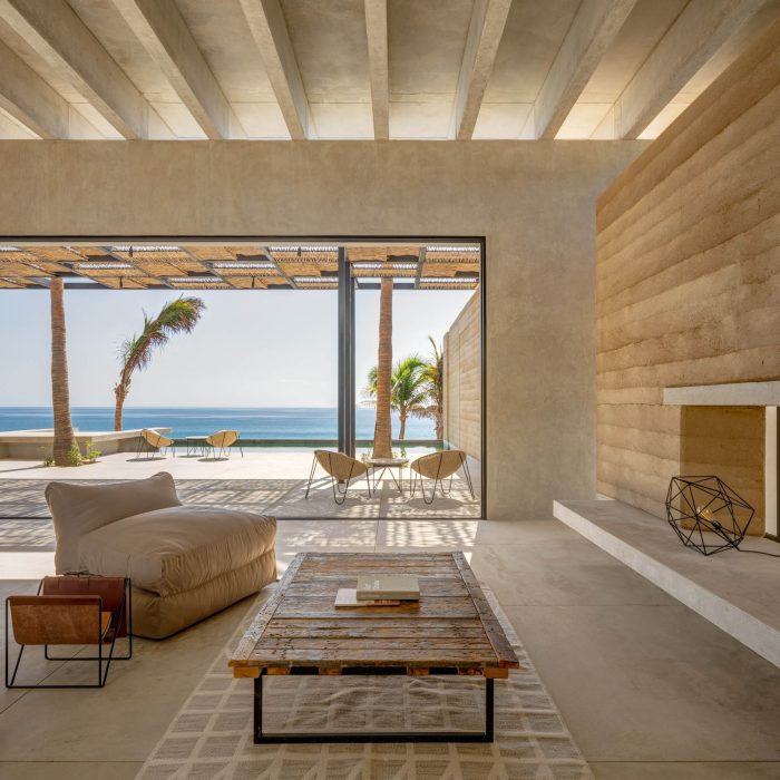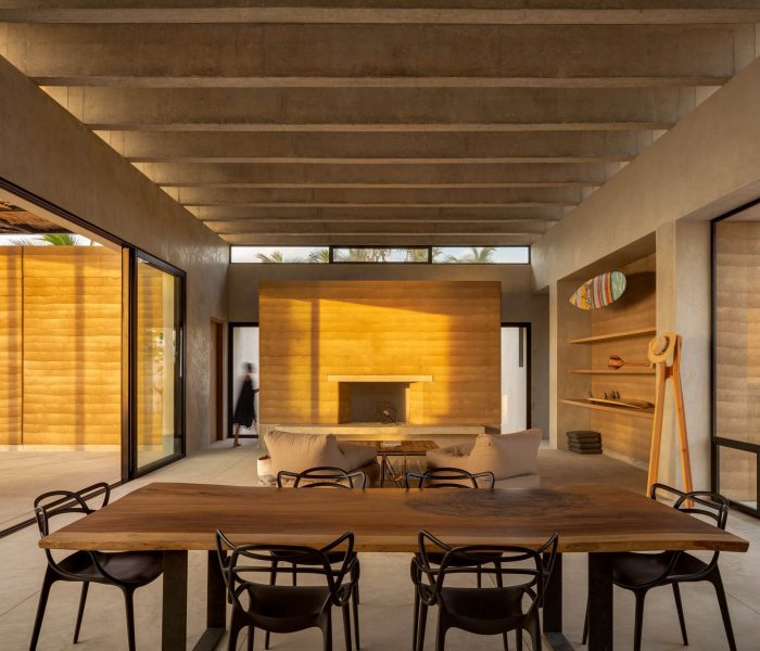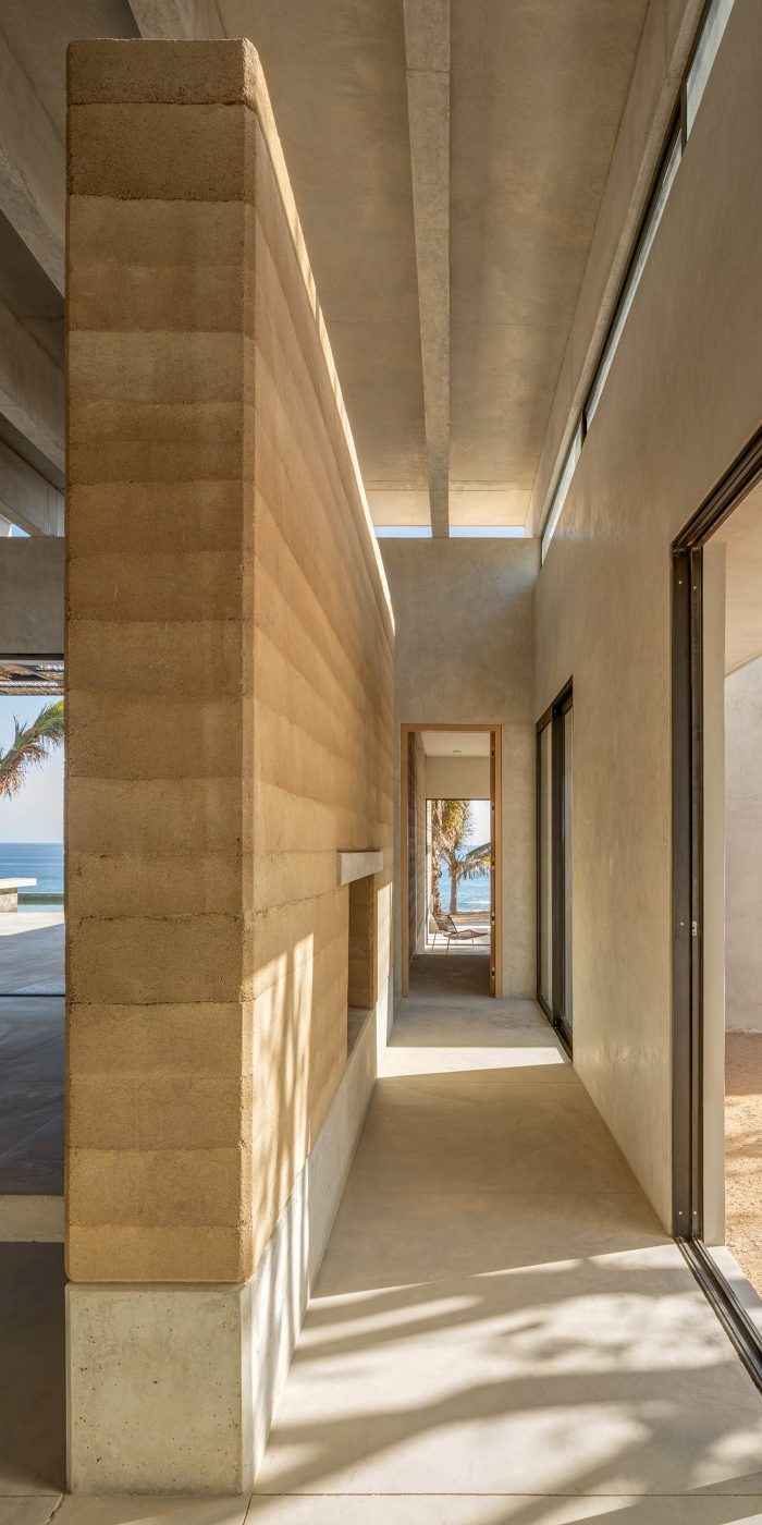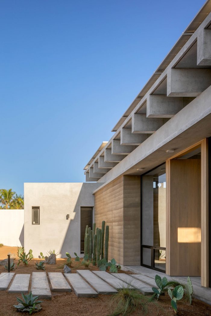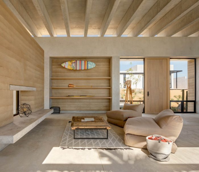 Our initial approach was to incorporate rammed earth construction to the most important spaces of the house and utilize a second material which is Concrete to express the other massing elements. The rammed earth walls are thermal insulating walls that also bring in warmth and humidity to the dry desert-scapes of the house. The walls contrast with the polished concrete floors, cement polished walls and T shape poured in place concrete slab over the great room. We wanted to explore the great room as an open palapa, which you commonly find in mainland coastal architecture. The light and cross ventilation come from the clear-story windows above, and the patios are located in every axis of the house, making this a passive design flow. Per the client's request for conditioned comfort, every room had to be equipped with Air-Conditioned space for summer use, but the way we designed the flow of the house allows the fresh coastal breeze and sound of waves to travel through each space. The design also travels from inside to outside, creating a seamless transition from a comfortable interior space to a Mediterranean-Baja landscape. The equipment necessary to operate the single-story four-bedroom off-grid home was 48 solar panels on the central flat roof, inverters, lithium batteries, and a propane generator to assist the solar system during higher consumption or on cloudy days