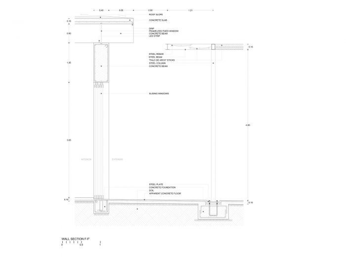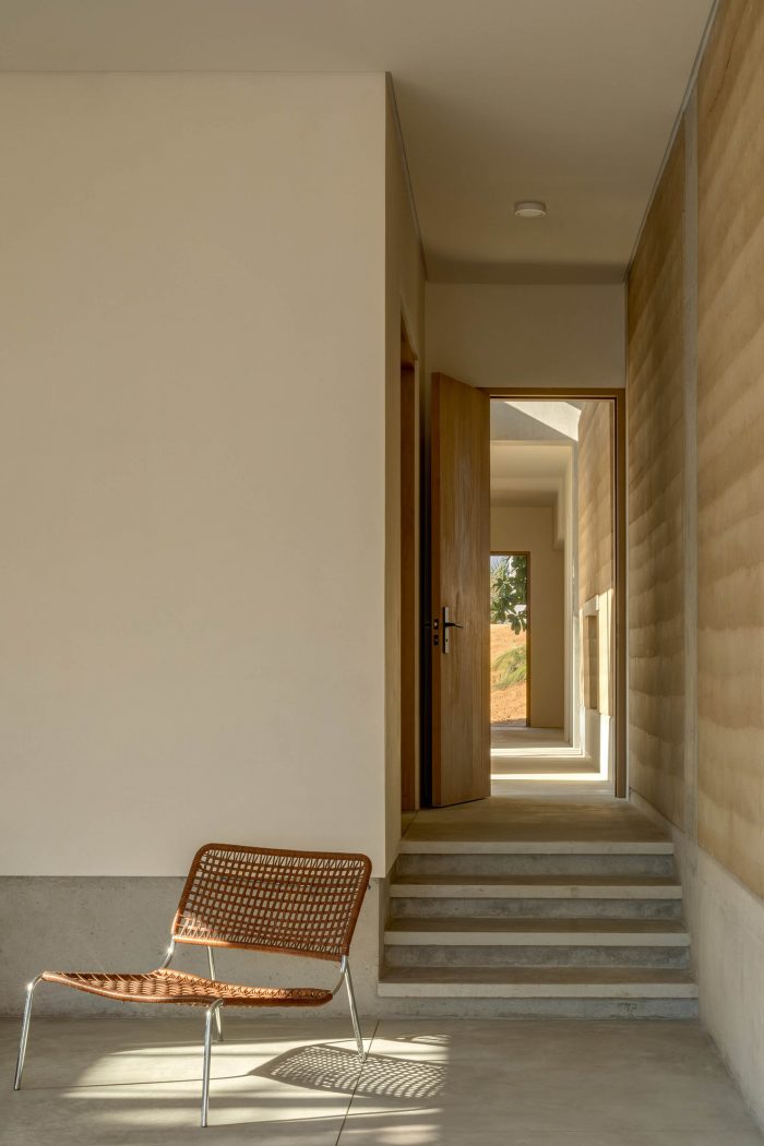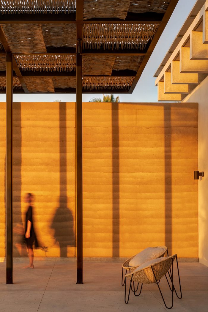 我们最初的方法是将夯土建筑纳入房屋最重要的空间,并利用第二种材料,即混凝土来表达其他的质量元素。夯土墙是隔热墙,也为房屋干燥的沙漠景观带来温暖和湿度。墙壁与抛光的混凝土地板、水泥抛光的墙壁和大房间上的T型混凝土板形成对比。我们想把大房间探索成一个开放的棕榈树,这在大陆沿海建筑中是很常见的。光线和交叉通风来自上方的透明层窗户,天井位于房子的每个轴线上,使之成为一个被动的设计流程。根据客户对空调舒适度的要求,每个房间都必须配备夏季使用的空调空间,但我们设计房屋流线的方式允许新鲜的海岸风和海浪声穿过每个空间。该设计还从内部到外部,创造了一个从舒适的内部空间到地中海-巴哈景观的无缝过渡。运营这个单层四卧室离网住宅所需的设备是中央平顶上的48块太阳能电池板、逆变器、锂电池和一台丙烷发电机,以便在消费较高或阴天时协助太阳能系统。