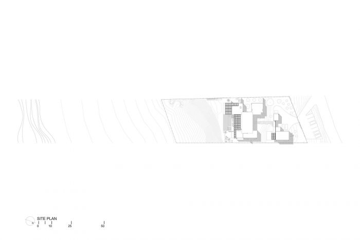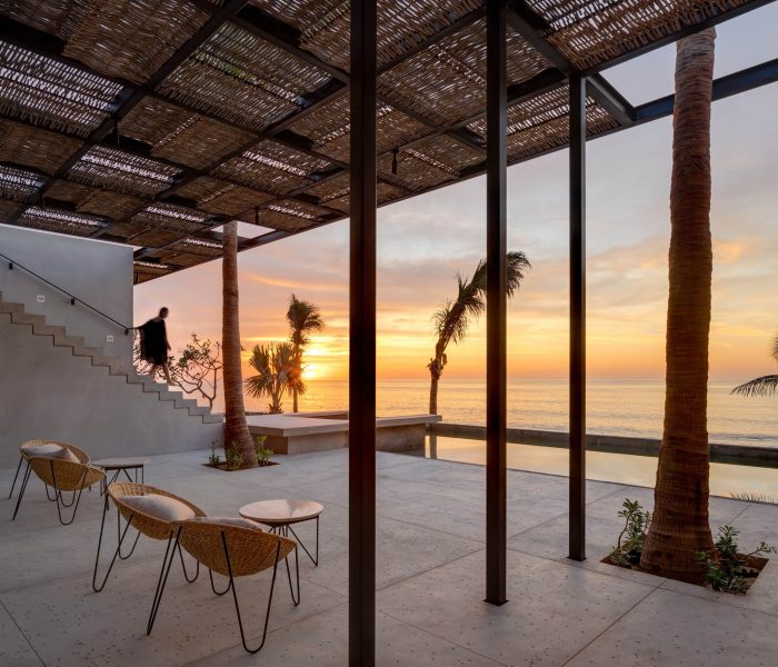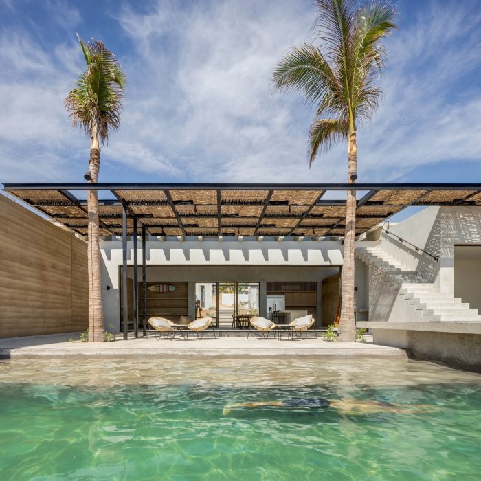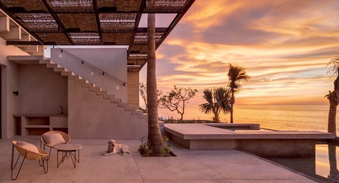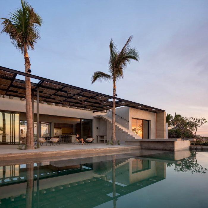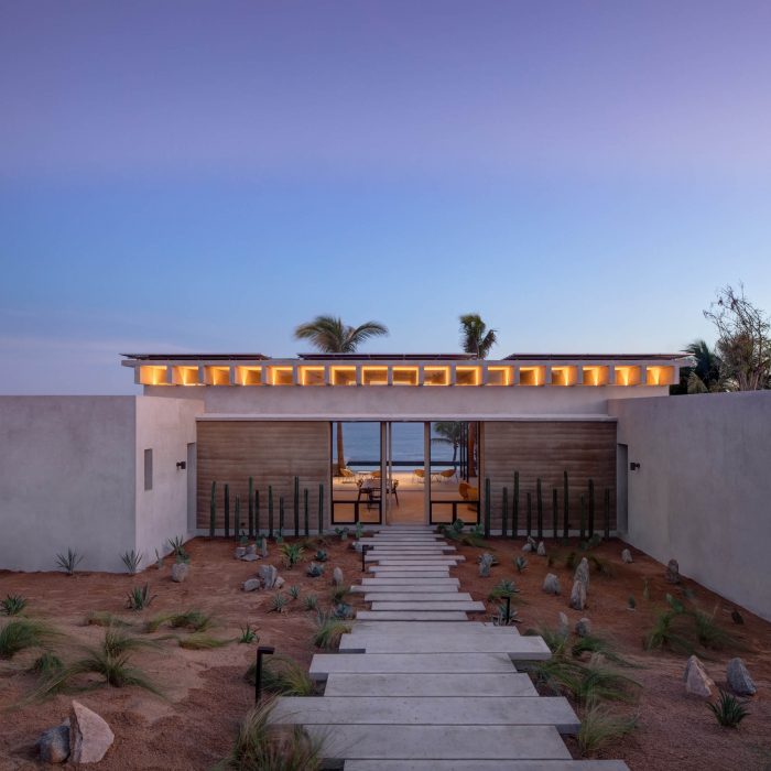 To educate the guest on off-grid technology, the solar panels were exposed on the edge of the great room slab to be easily seen upon arrival, and the solar battery room was clearly seen through a glass door next to the entry powder. The rest of the equipment was concealed, which consisted of a waste treatment plant, a large underground cistern for potable water that unfortunately has to be trucked in, but in response to this, we added a cistern for treated water to use for landscape irrigation as well as a propane gas tank to heat water, stove, and jacuzzi. Again, since this was our first solar project, nature and economy forced us to create efficiency in design and function. From the beginning to the end, we wanted to create contemporary architecture in Baja California, utilizing horizontal lines, large shaded outdoor-indoor spaces, and local materials to build a simple yet extraordinary house.