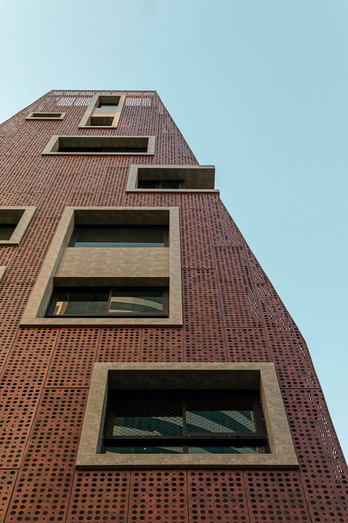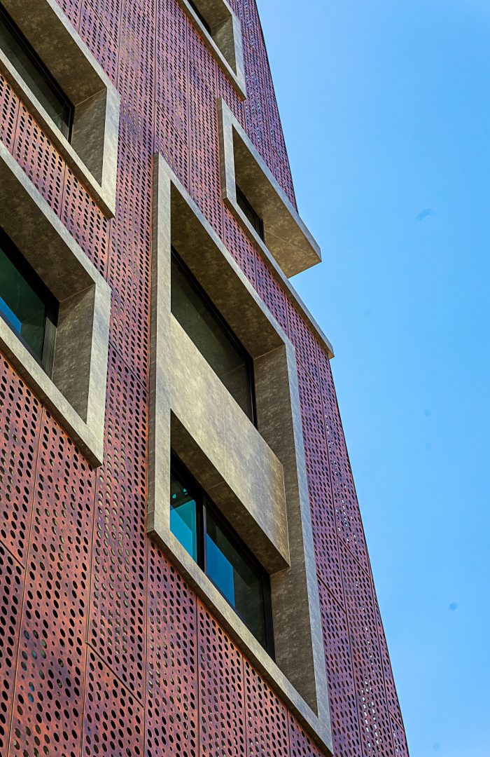 Finally, to ensure flatness on the facades, the sheets were bent on all four sides, thus increasing their rigidity. Although the sheets were randomly perforated, the joints were aligned and the volume was harmonious, several studies were carried out until the final fixing model produced an alignment of the slabs and the midpoint of each floor. The study ensured optimization in the secondary structure for fixing the plates: there are only three horizontal profiles per floor, and the upper and lower profiles were also combined to fix the plates of the adjacent floors.