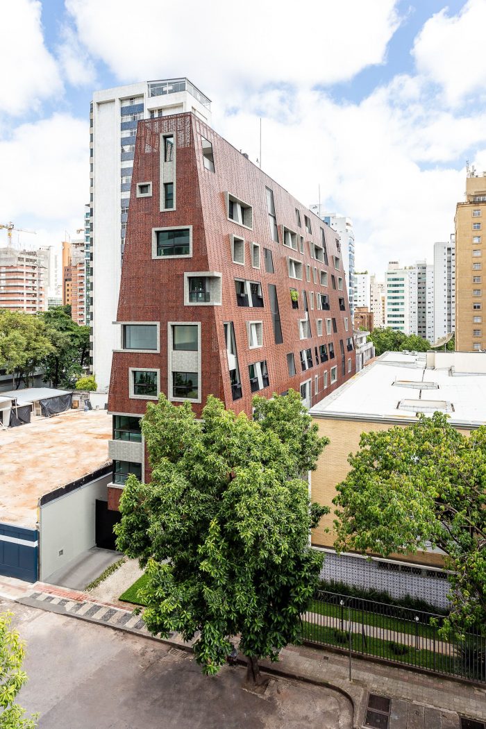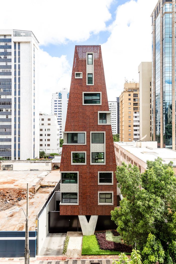 The CASAMIRADOR Savassi residential building, completed in 2021, is located in Belo Horizonte, Minas Gerais, Brazil, and features boldly designed architecture that stands out in the local landscape. The building has 14 lofts and 24 studios and is spread over nine floors in construction and located on a narrow lot, with a width of 12.7 meters. The challenge of its volumetric mathematics, to respect distances, was one of the factors that influenced non-obvious decisions resulting in architecture created with its own identity.