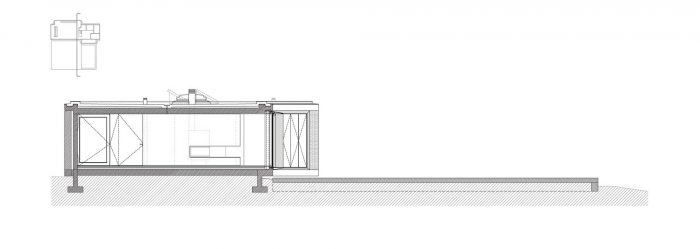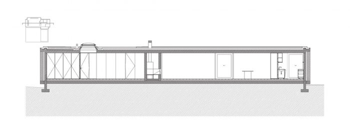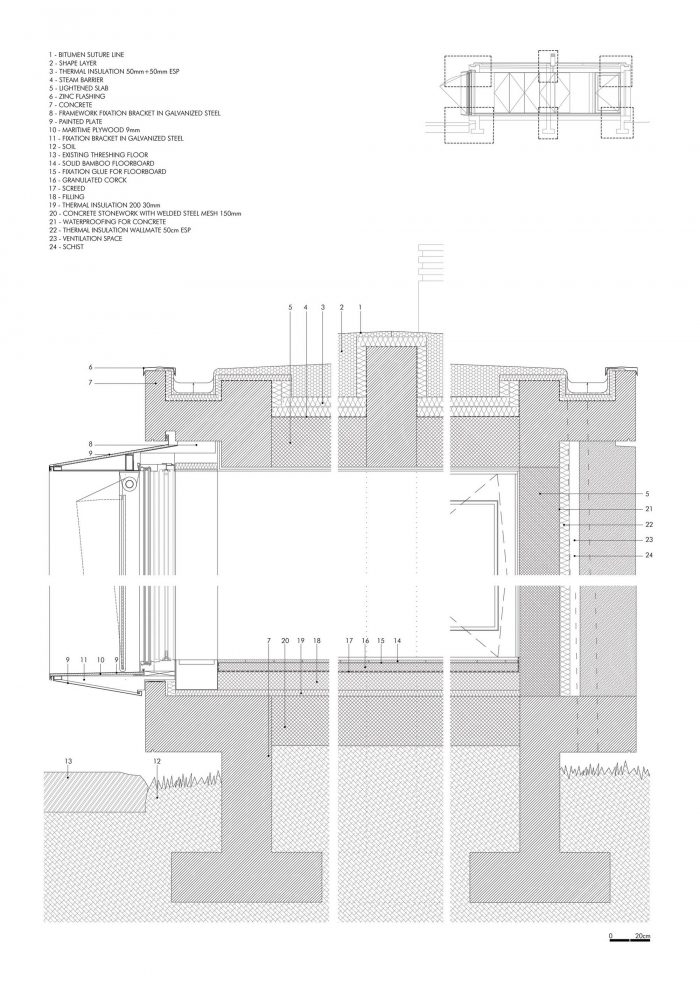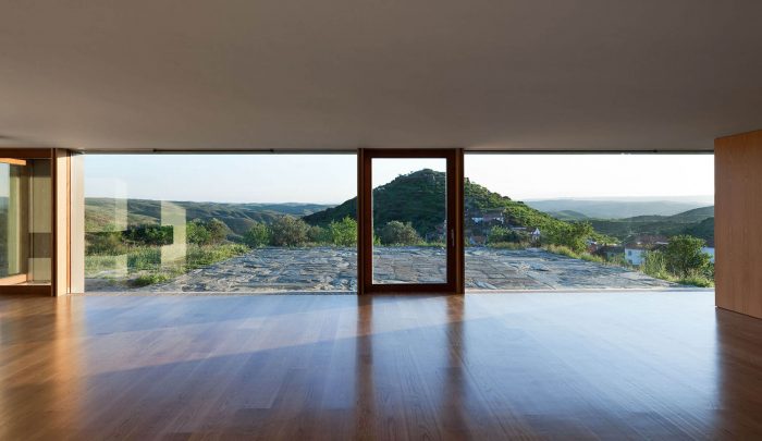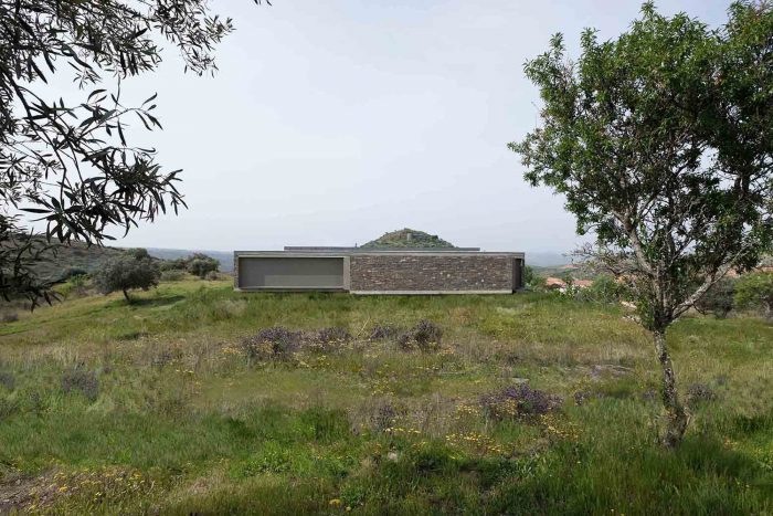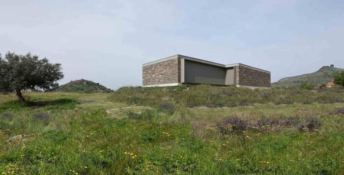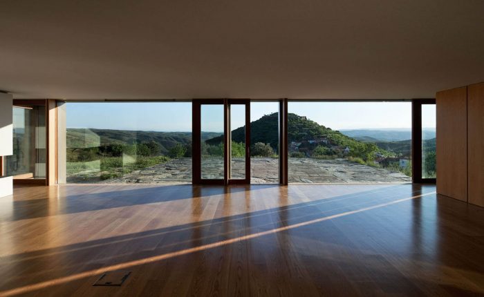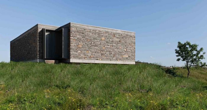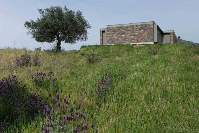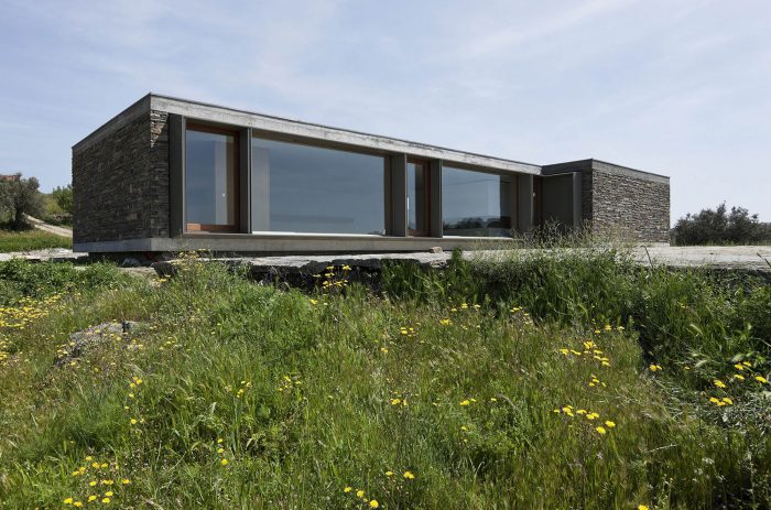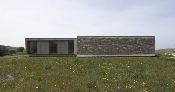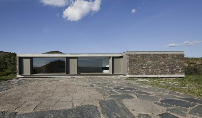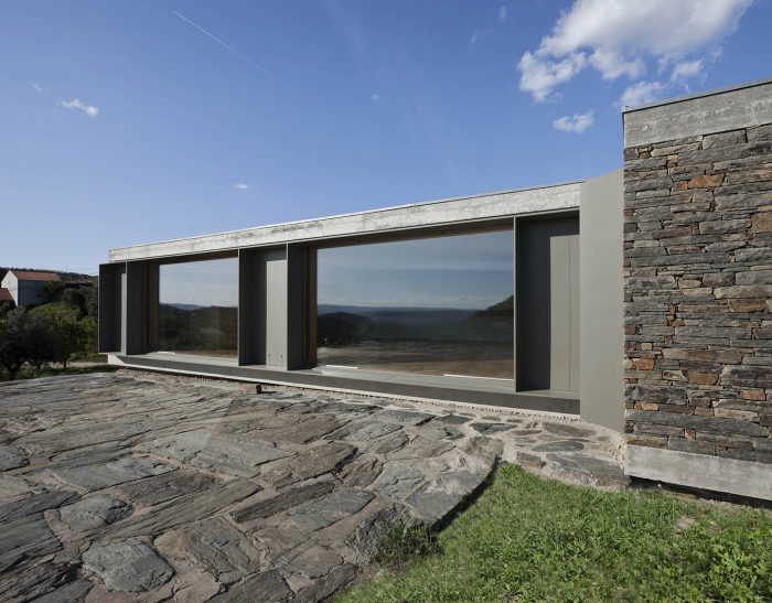 The existing walls, traditional in this area of the country, are rehabilitated in all of the surrounding terrain. The lightness of the house is accentuated by its fragmentation on the four corners, asymmetric for different reasons, either looking for a landscape framing, due to the dominant winds or even sun exposure.